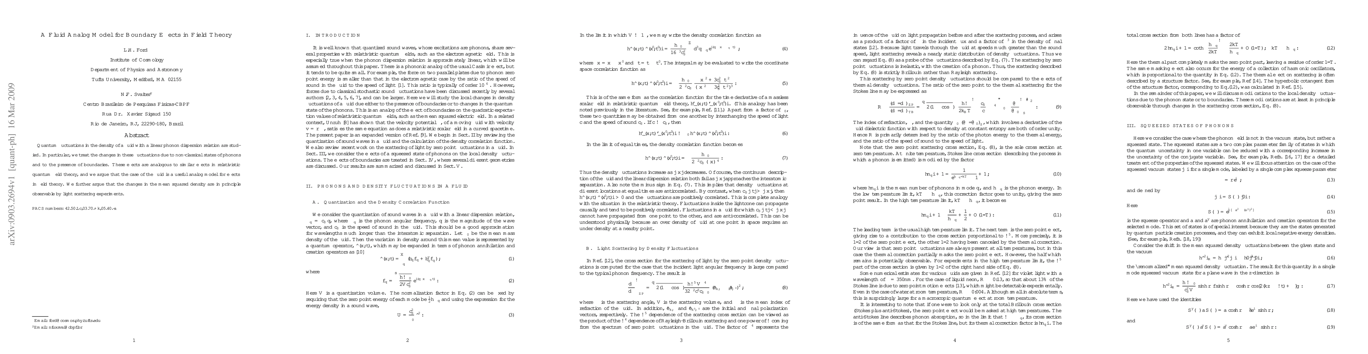Quantum fluctuations in the density of a fluid with a linear phonon dispersion relation are studied. In particular, we treat the changes in these fluctuations due to non-classical states of phonons and to the presence of boundaries. These effects are analogous to similar effects in relativistic quantum field theory, and we argue that the case of the fluid is a useful analog model for effects in field theory. We further argue that the changes in the mean squared density are in principle observable by light scattering experiments.
