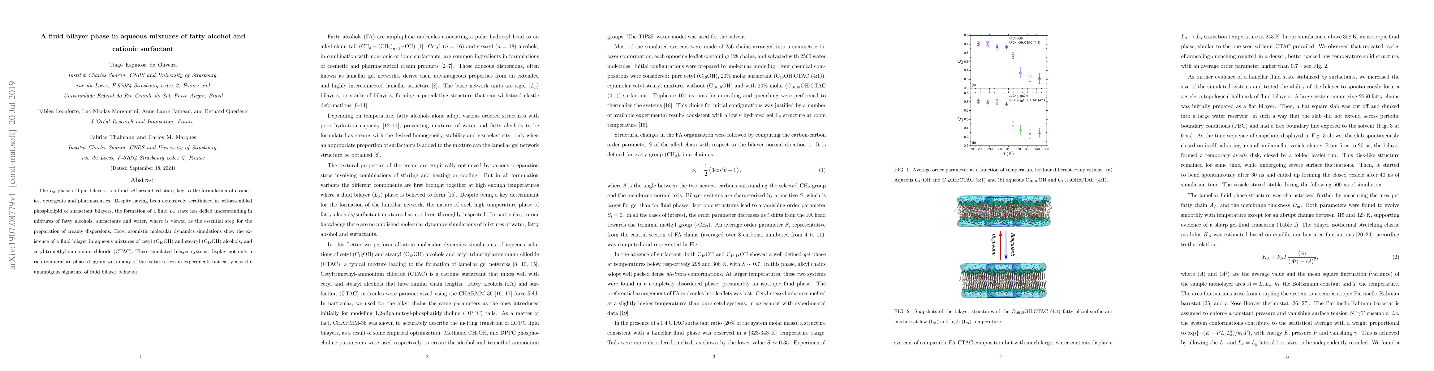 This paper reports the existence of a fluid $L_\alpha$ bilayer phase in aqueous mixtures of fatty alcohols and cationic surfactants, using atomistic molecular dynamics simulations. The findings reveal a rich temperature phase diagram and confirm the fluid bilayer behavior, crucial for the formulation of cosmetic, detergent, and pharmaceutical products.