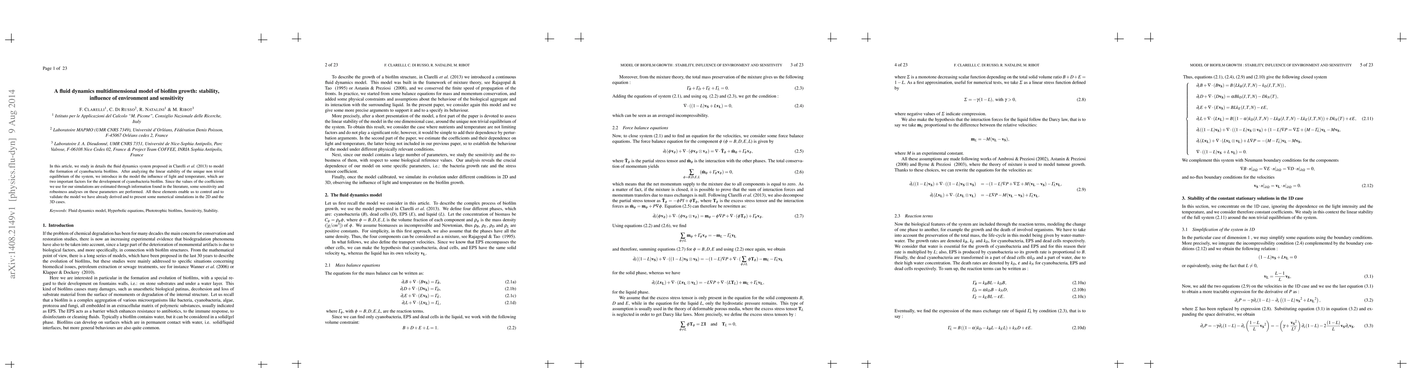 In this article, we study in details the fluid dynamics system proposed in Clarelli et al (2013) to model the formation of cyanobacteria biofilms. After analyzing the linear stability of the unique non trivial equilibrium of the system, we introduce in the model the influence of light and temperature, which are two important factors for the development of cyanobacteria biofilm. Since the values of the coefficients we use for our simulations are estimated through information found in the literature, some sensitivity and robustness analyses on these parameters are performed. All these elements enable us to control and to validate the model we have already derived and to present some numerical simulations in the 2D and the 3D cases.
