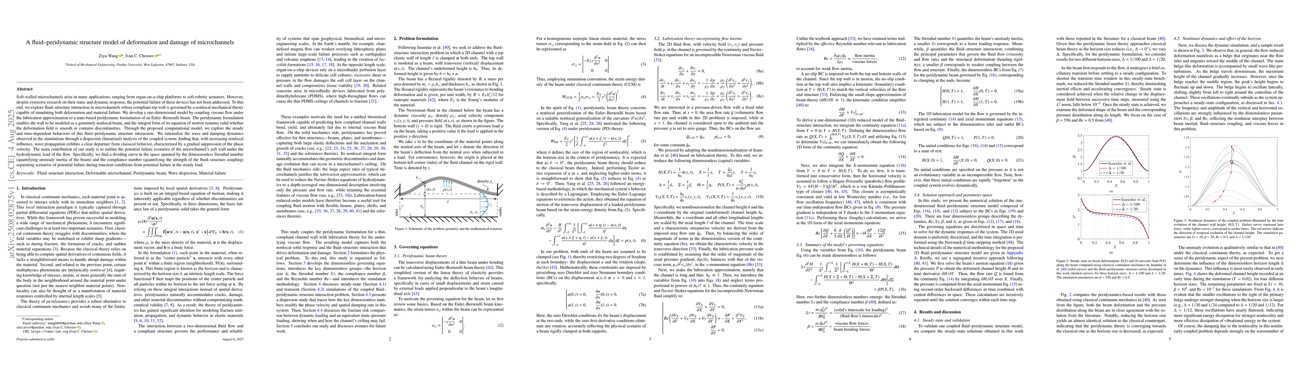 Soft-walled microchannels arise in many applications, ranging from organ-on-a-chip platforms to soft-robotic actuators. However, despite extensive research on their static and dynamic response, the potential failure of these devices has not been addressed. To this end, we explore fluid--structure interaction in microchannels whose compliant top wall is governed by a nonlocal mechanical theory capable of simulating both deformation and material failure. We develop a one-dimensional model by coupling viscous flow under the lubrication approximation to a state-based peridynamic formulation of an Euler--Bernoulli beam. The peridynamic formulation enables the wall to be modeled as a genuinely nonlocal beam, and the integral form of its equation of motion remains valid whether the deformation field is smooth or contains discontinuities. Through the proposed computational model, we explore the steady and time-dependent behaviors of this fluid--peridynamic structure interaction. We rationalize the wave and damping dynamics observed in the simulations through a dispersion (linearized) analysis of the coupled system, finding that, with increasing nonlocal influence, wave propagation exhibits a clear departure from classical behavior, characterized by a gradual suppression of the phase velocity. The main contribution of our study is to outline the potential failure scenarios of the microchannel's soft wall under the hydrodynamic load of the flow. Specifically, we find a dividing curve in the space spanned by the dimensionless Strouhal number (quantifying unsteady inertia of the beam) and the compliance number (quantifying the strength of the fluid--structure coupling) separating scenarios of potential failure during transient conditions from potential failure at the steady load.