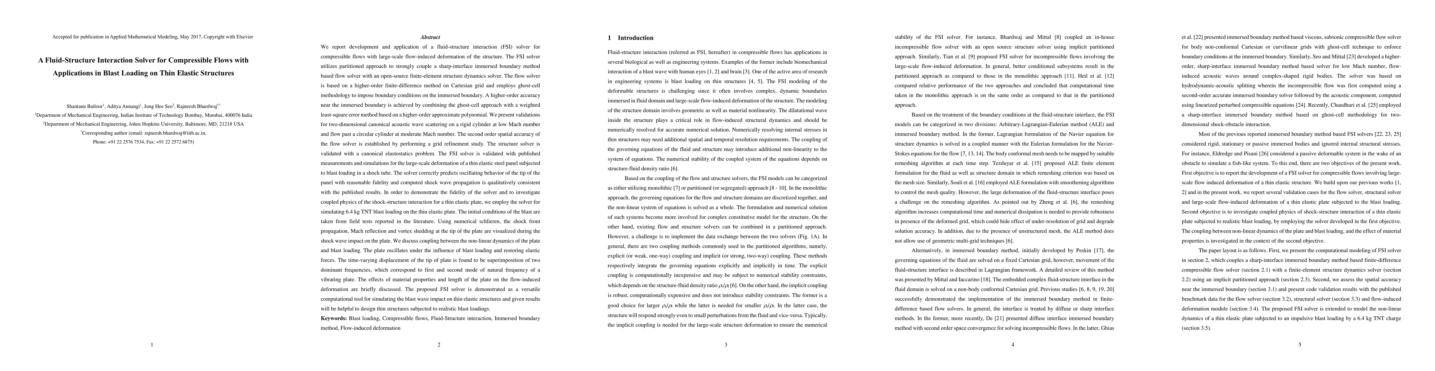 We report development and application of a fluid-structure interaction (FSI) solver for compressible flows with large-scale flow-induced deformation of the structure. The FSI solver utilizes partitioned approach to strongly couple a sharp-interface immersed boundary method based flow solver with an open-source finite-element structure dynamics solver. The flow solver is based on a higher-order finite-difference method on Cartesian grid and employs ghost-cell methodology to impose boundary conditions on the immersed boundary. A higher-order accuracy near the immersed boundary is achieved by combining the ghost-cell approach with a weighted least-square error method based on a higher-order approximate polynomial. The second order spatial accuracy of the flow solver is established by performing a grid refinement study. The structure solver is validated with a canonical elastostatics problem. The FSI solver is validated with published measurements and simulations for the large-scale deformation of a thin elastic steel panel subjected to blast loading in a shock tube. The solver correctly predicts oscillating behavior of the tip of the panel with reasonable fidelity and computed shock wave propagation is qualitatively consistent with the published results. In order to demonstrate the fidelity of the solver and to investigate coupled physics of the shock-structure interaction for a thin elastic plate, we employ the solver for simulating 6.4 kg TNT blast loading on the thin elastic plate. The initial conditions of the blast are taken from field tests reported in the literature. Using numerical schlieren, the shock front propagation, Mach reflection and vortex shedding at the tip of the plate are visualized during the shock wave impact on the plate. We discuss coupling between the non-linear dynamics of the plate and blast loading.