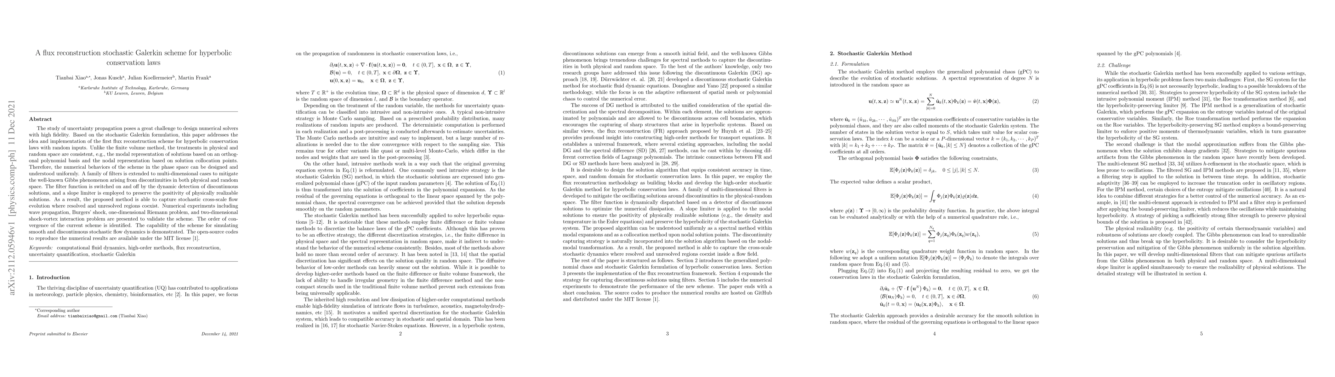 The study of uncertainty propagation poses a great challenge to design numerical solvers with high fidelity. Based on the stochastic Galerkin formulation, this paper addresses the idea and implementation of the first flux reconstruction scheme for hyperbolic conservation laws with random inputs. Unlike the finite volume method, the treatments in physical and random space are consistent, e.g., the modal representation of solutions based on an orthogonal polynomial basis and the nodal representation based on solution collocation points. Therefore, the numerical behaviors of the scheme in the phase space can be designed and understood uniformly. A family of filters is extended to multi-dimensional cases to mitigate the well-known Gibbs phenomenon arising from discontinuities in both physical and random space. The filter function is switched on and off by the dynamic detection of discontinuous solutions, and a slope limiter is employed to preserve the positivity of physically realizable solutions. As a result, the proposed method is able to capture stochastic cross-scale flow evolution where resolved and unresolved regions coexist. Numerical experiments including wave propagation, Burgers' shock, one-dimensional Riemann problem, and two-dimensional shock-vortex interaction problem are presented to validate the scheme. The order of convergence of the current scheme is identified. The capability of the scheme for simulating smooth and discontinuous stochastic flow dynamics is demonstrated. The open-source codes to reproduce the numerical results are available under the MIT license.