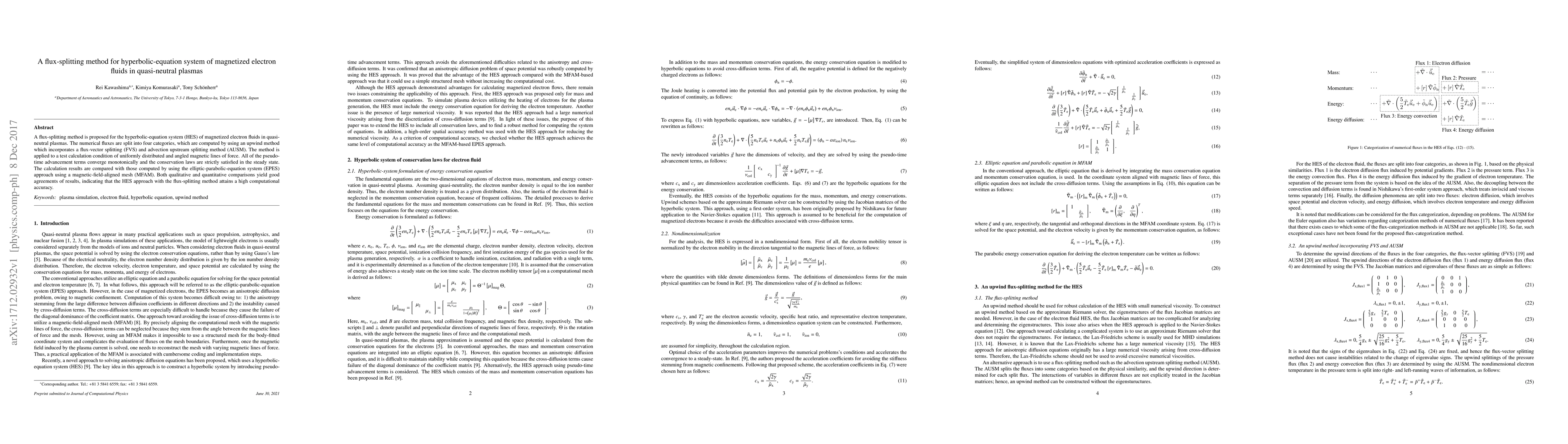 This research introduces a flux-splitting method for numerically solving hyperbolic equations in magnetized electron fluids of quasi-neutral plasmas. The method, combining upwind, FVS, and AUSM techniques, demonstrates monotonic convergence and strict conservation law adherence. Comparisons with an elliptic-parabolic approach using a magnetic-field-aligned mesh show good agreement, validating the high computational accuracy of this new method.