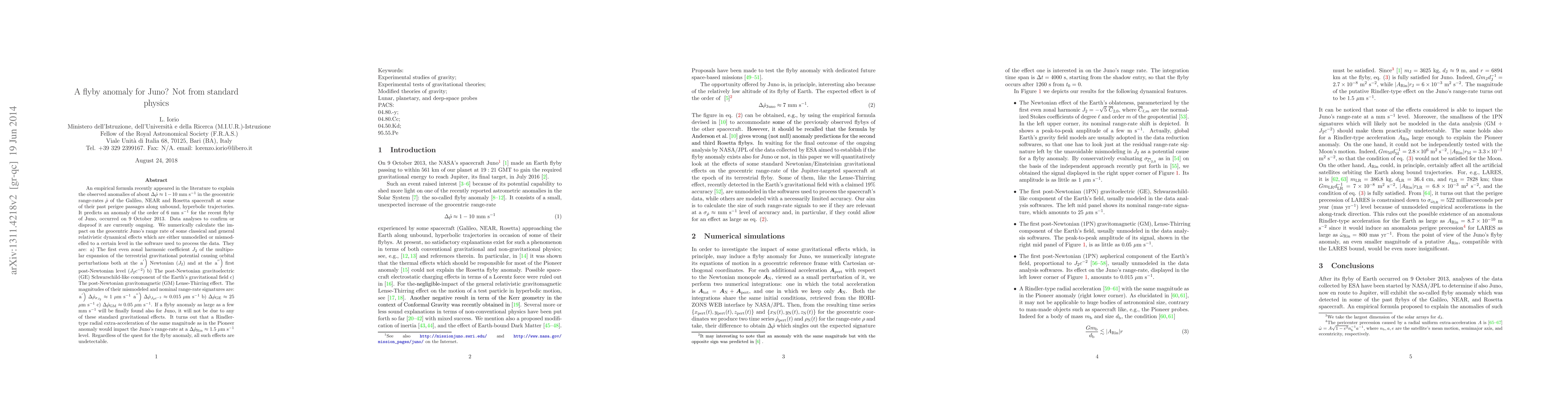 An empirical formula recently appeared in the literature to explain the observed anomalies of about $\Delta\dot\rho\approx 1-10$ mm s$^{-1}$ in the geocentric range-rates $\dot\rho$ of the Galileo, NEAR and Rosetta spacecraft at some of their past perigee passages along unbound, hyperbolic trajectories. It predicts an anomaly of the order of $6$ mm s$^{-1}$ for the recent flyby of Juno, occurred on 9 October 2013. Data analyses to confirm or disproof it are currently ongoing. We numerically calculate the impact on the geocentric Juno's range rate of some classical and general relativistic dynamical effects which are either unmodelled or mismodelled to a certain level in the software used to process the data. They are: a) The first even zonal harmonic coefficient $J_2$ of the multipolar expansion of the terrestrial gravitational potential causing orbital perturbations both at the $\left.{\rm a}^{'}\right)$ Newtonian ($J_2$) and at the $\left. {\rm a}^{''}\right)$ first post-Newtonian level ($J_2 c^{-2}$) b) The post-Newtonian gravitoelectric (GE) Schwarschild-like component of the Earth's gravitational field c) The post-Newtonian gravitomagnetic (GM) Lense-Thirring effect. The magnitudes of their mismodeled and nominal range-rate signatures are: $\left. {\rm a}^{'}\right)$ $\Delta\dot\rho_{\sigma_{J_2}} \approx 1$ $\mu$m s$^{-1}$ $\left. {\rm a}^{''}\right)$ $\Delta\dot\rho_{J_2 c^{-2}} \approx 0.015$ $\mu$m s$^{-1}$ b) $\Delta\dot\rho_{\rm GE} \approx 25$ $\mu$m s$^{-1}$ c) $\Delta\dot\rho_{\rm GM} \approx 0.05$ $\mu$m s$^{-1}$. If a flyby anomaly as large as a few mm s$^{-1}$ will be finally found also for Juno, it will not be due to any of these standard gravitational effects. (Abridged)