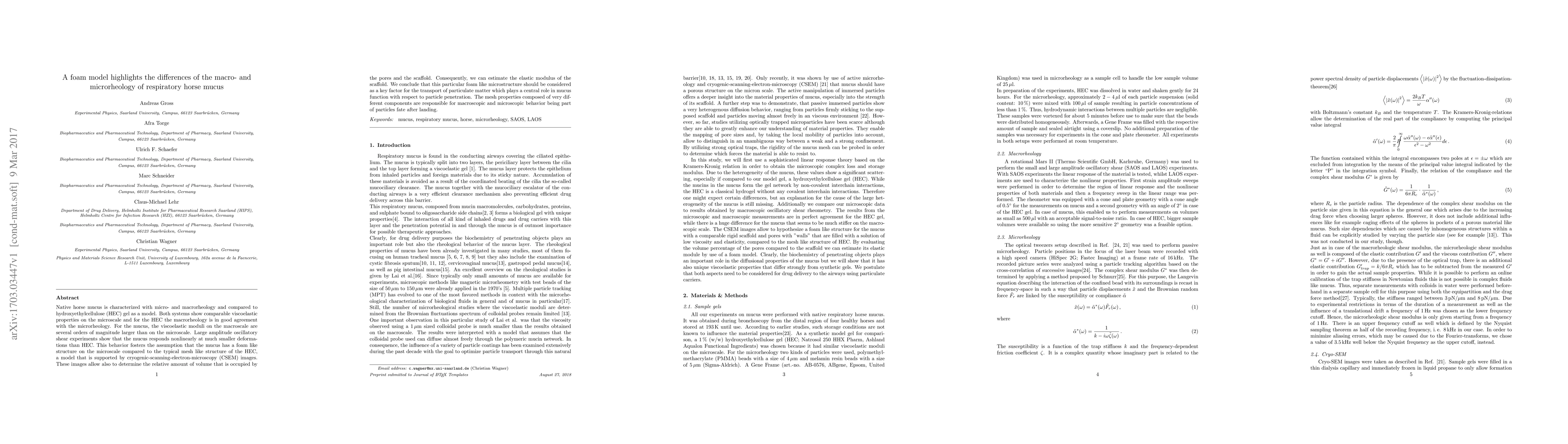 Native horse mucus is characterized with micro- and macrorheology and compared to hydroxyethylcellulose (HEC) gel as a model. Both systems show comparable viscoelastic properties on the microscale and for the HEC the macrorheology is in good agreement with the microrheology. For the mucus, the viscoelastic moduli on the macroscale are several orders of magnitude larger than on the microscale. Large amplitude oscillatory shear experiments show that the mucus responds nonlinearly at much smaller deformations than HEC. This behavior fosters the assumption that the mucus has a foam like structure on the microscale compared to the typical mesh like structure of the HEC, a model that is supported by cryogenic-scanning-electron-microscopy (CSEM) images. These images allow also to determine the relative amount of volume that is occupied by the pores and the scaffold. Consequently, we can estimate the elastic modulus of the scaffold. We conclude that this particular foam like microstructure should be considered as a key factor for the transport of particulate matter which plays a central role in mucus function with respect to particle penetration. The mesh properties composed of very different components are responsible for macroscopic and microscopic behavior being part of particles fate after landing.