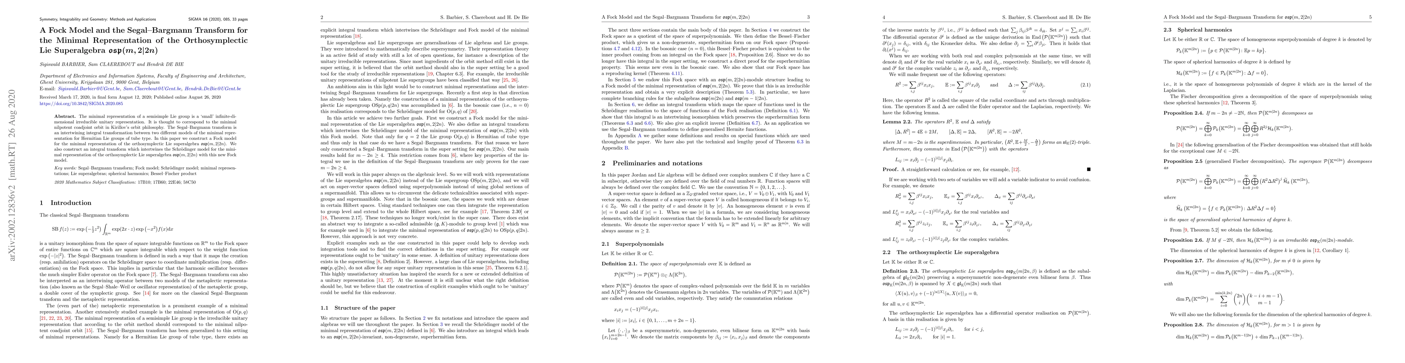 The minimal representation of a semisimple Lie group is a 'small' infinite-dimensional irreducible unitary representation. It is thought to correspond to the minimal nilpotent coadjoint orbit in Kirillov's orbit philosophy. The Segal-Bargmann transform is an intertwining integral transformation between two different models of the minimal representation for Hermitian Lie groups of tube type. In this paper we construct a Fock model for the minimal representation of the orthosymplectic Lie superalgebra $\mathfrak{osp}(m,2|2n)$. We also construct an integral transform which intertwines the Schr\"odinger model for the minimal representation of the orthosymplectic Lie superalgebra $\mathfrak{osp}(m,2|2n)$ with this new Fock model.