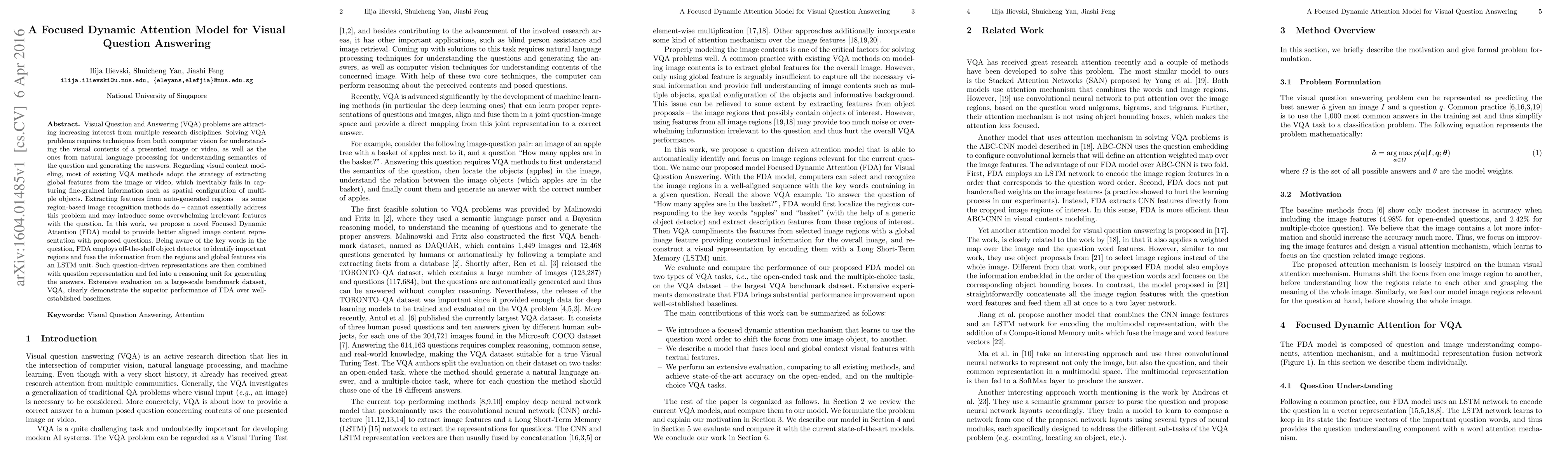 A new model called Focused Dynamic Attention (FDA) improves performance in Visual Question Answering (VQA) tasks by focusing on important image regions relevant to the question, outperforming existing methods.
