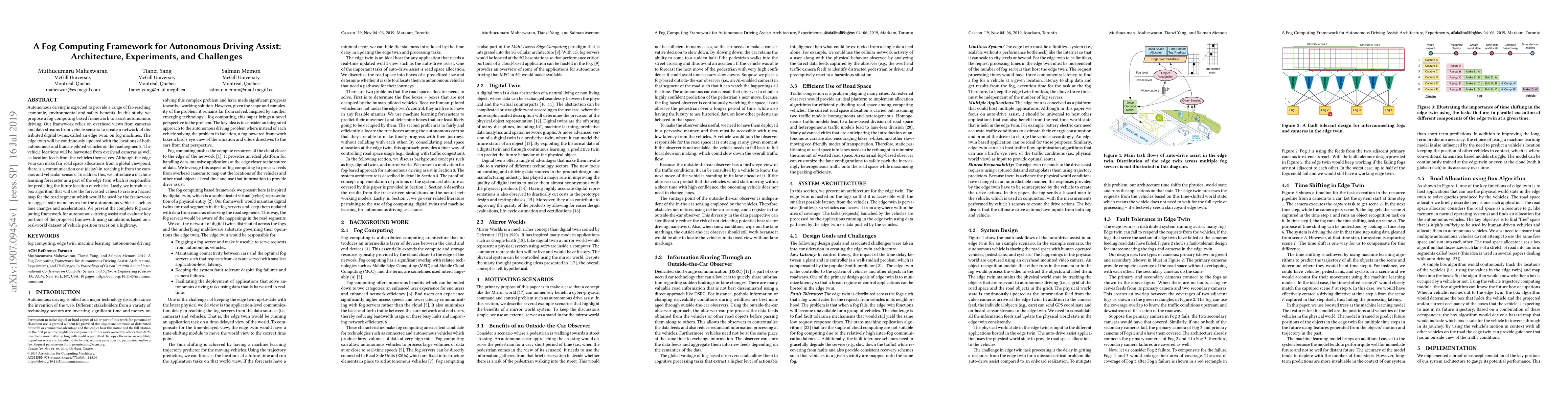 Autonomous driving is expected to provide a range of far-reaching economic, environmental and safety benefits. In this study, we propose a fog computing based framework to assist autonomous driving. Our framework relies on overhead views from cameras and data streams from vehicle sensors to create a network of distributed digital twins, called an edge twin, on fog machines. The edge twin will be continuously updated with the locations of both autonomous and human-piloted vehicles on the road segments. The vehicle locations will be harvested from overhead cameras as well as location feeds from the vehicles themselves. Although the edge twin can make fair road space allocations from a global viewpoint, there is a communication cost (delay) in reaching it from the cameras and vehicular sensors. To address this, we introduce a machine learning forecaster as a part of the edge twin which is responsible for predicting the future location of vehicles. Lastly, we introduce a box algorithm that will use the forecasted values to create a hazard map for the road segment which would be used by the framework to suggest safe manoeuvres for the autonomous vehicles such as lane changes and accelerations. We present the complete fog computing framework for autonomous driving assist and evaluate key portions of the proposed framework using simulations based on a real-world dataset of vehicle position traces on a highway