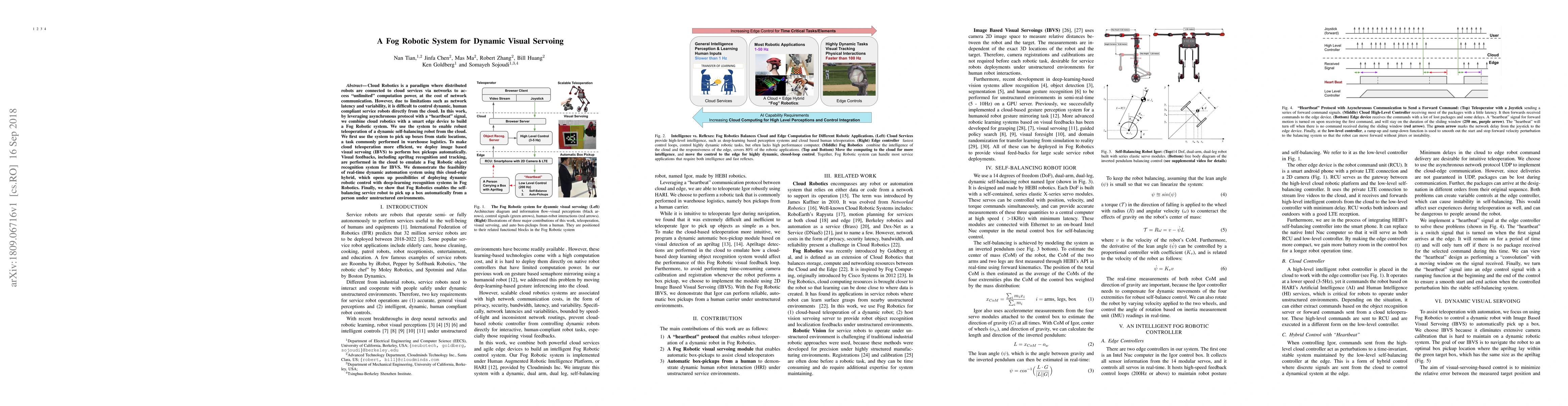 This paper presents a Fog Robotic system combining cloud and edge computing to enable robust teleoperation of a dynamic self-balancing robot. It uses asynchronous protocols and image-based visual servoing for efficient box pickups in warehouse logistics, demonstrating real-time dynamic automation in unstructured environments.