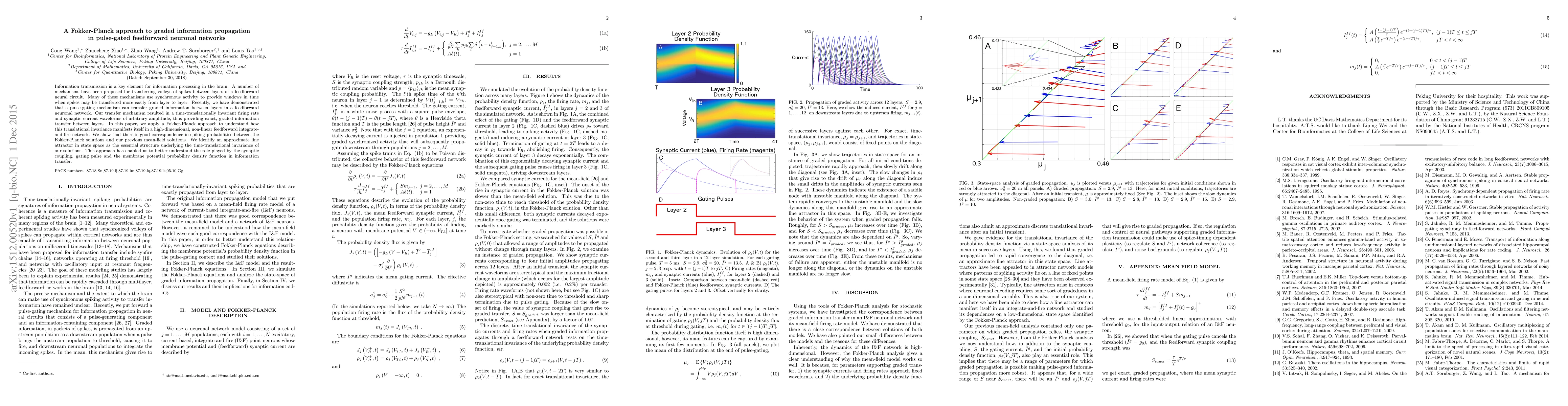 This paper uses a Fokker-Planck approach to analyze graded information propagation in pulse-gated feedforward neuronal networks, revealing a time-translationally invariant firing rate and identifying an approximate line attractor in state space that underpins this invariance. The study highlights the roles of synaptic coupling, gating pulses, and membrane potential distributions in information transfer.