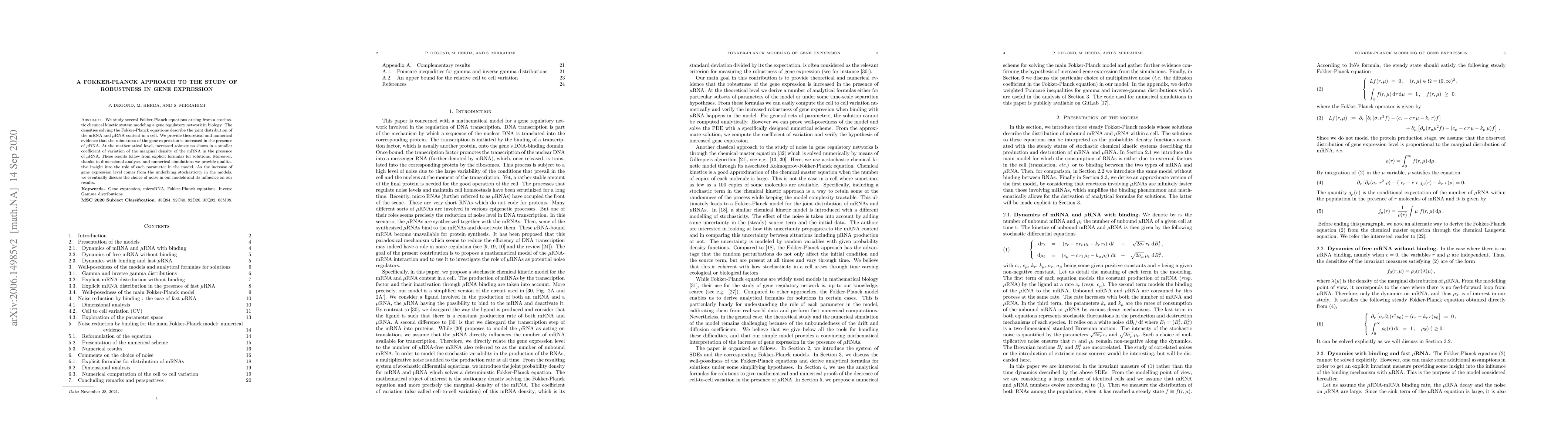 We study several Fokker-Planck equations arising from a stochastic chemical kinetic system modeling a gene regulatory network in biology. The densities solving the Fokker-Planck equations describe the joint distribution of the messenger RNA and micro RNA content in a cell. We provide theoretical and numerical evidences that the robustness of the gene expression is increased in the presence of micro RNA. At the mathematical level, increased robustness shows in a smaller coefficient of variation of the marginal density of the messenger RNA in the presence of micro RNA. These results follow from explicit formulas for solutions. Moreover, thanks to dimensional analyses and numerical simulations we provide qualitative insight into the role of each parameter in the model. As the increase of gene expression level comes from the underlying stochasticity in the models, we eventually discuss the choice of noise in our models and its influence on our results.