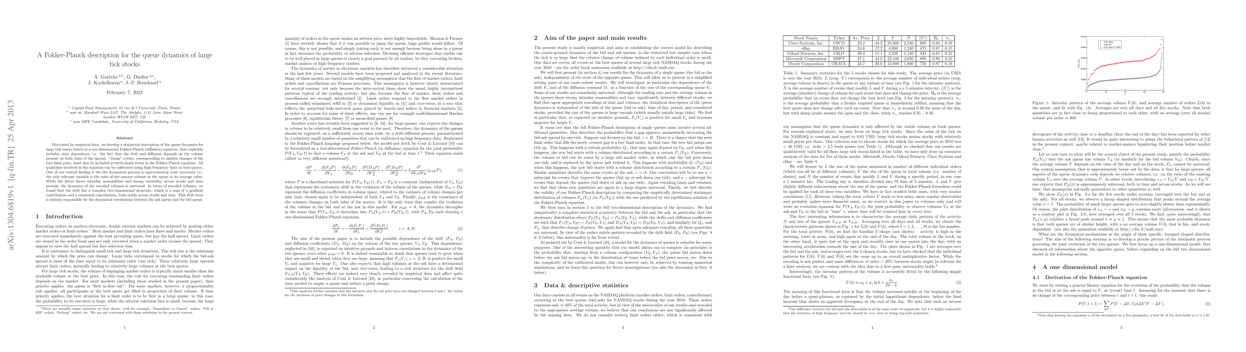 This research introduces a Fokker-Planck model to describe large tick stock queue dynamics, incorporating state-dependent drift and diffusion, and 'jump' events. The key finding is scale invariance, where the volume ratio to its average is crucial. The model reveals a universal, rescaled volume dynamics with a complex drift term, explaining correlations between ask and bid queues.