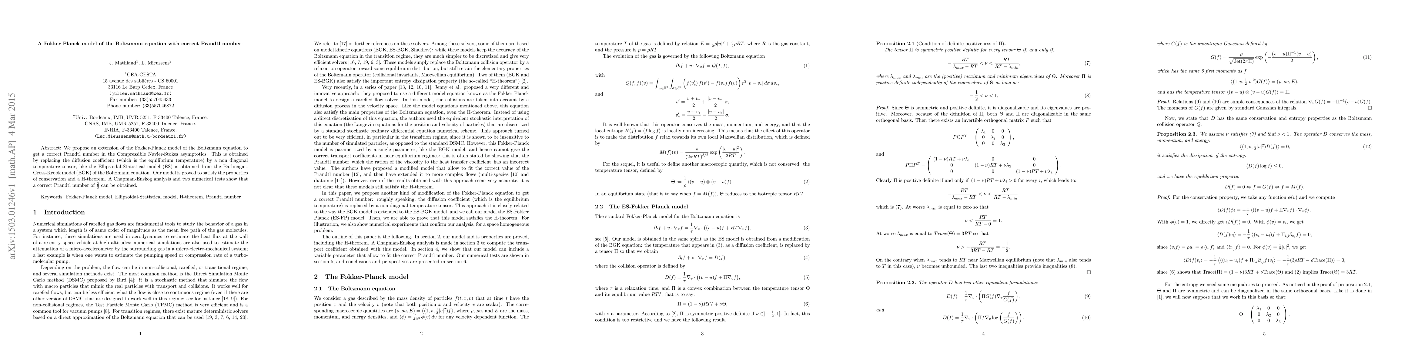 We propose an extension of the Fokker-Planck model of the Boltzmann equation to get a correct Prandtl number in the Compressible Navier-Stokes asymptotics. This is obtained by replacing the diffusion coefficient (which is the equilibrium temperature) by a non diagonal temperature tensor, like the Ellipsoidal-Statistical model (ES) is obtained from the Bathnagar-Gross-Krook model (BGK) of the Boltzmann equation. Our model is proved to satisfy the properties of conservation and a H-theorem. A Chapman-Enskog analysis and two numerical tests show that a correct Prandtl number of 2/3 can be obtained.