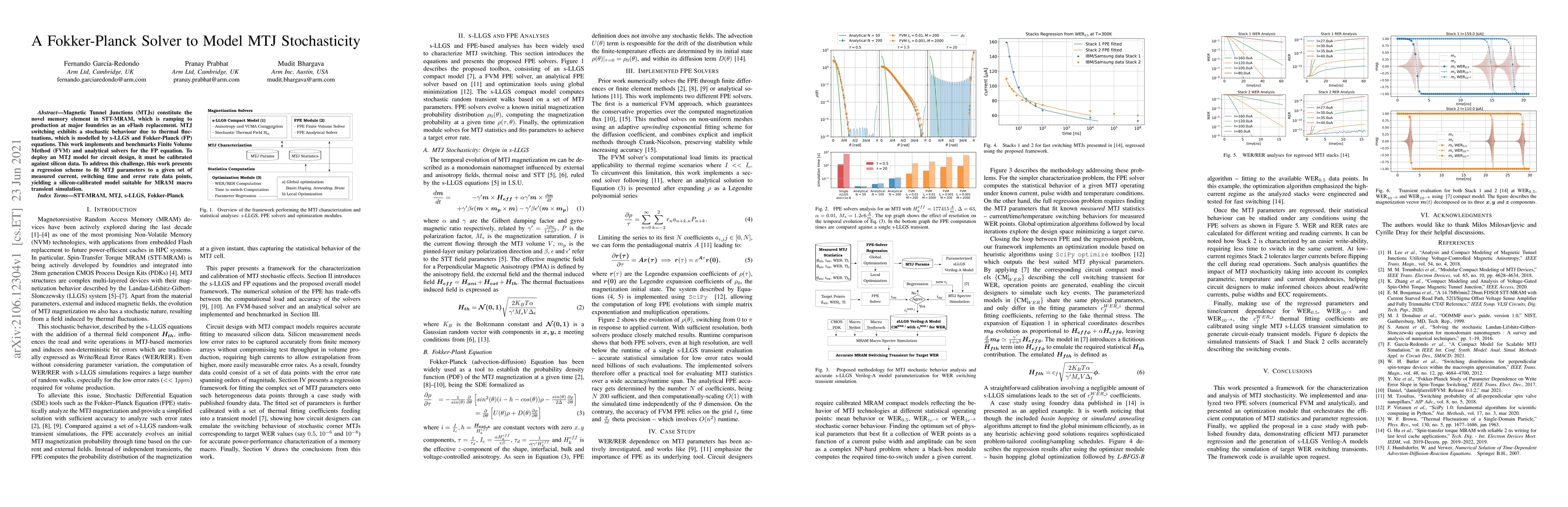 The work introduces a practical FPE solver tool for evaluating MTJ statistics, a regression framework for fitting complex MTJ parameter sets to heterogeneous data points, and demonstrates its application in generating circuit-ready s-LLGS Verilog-A models for target WER switching transients.