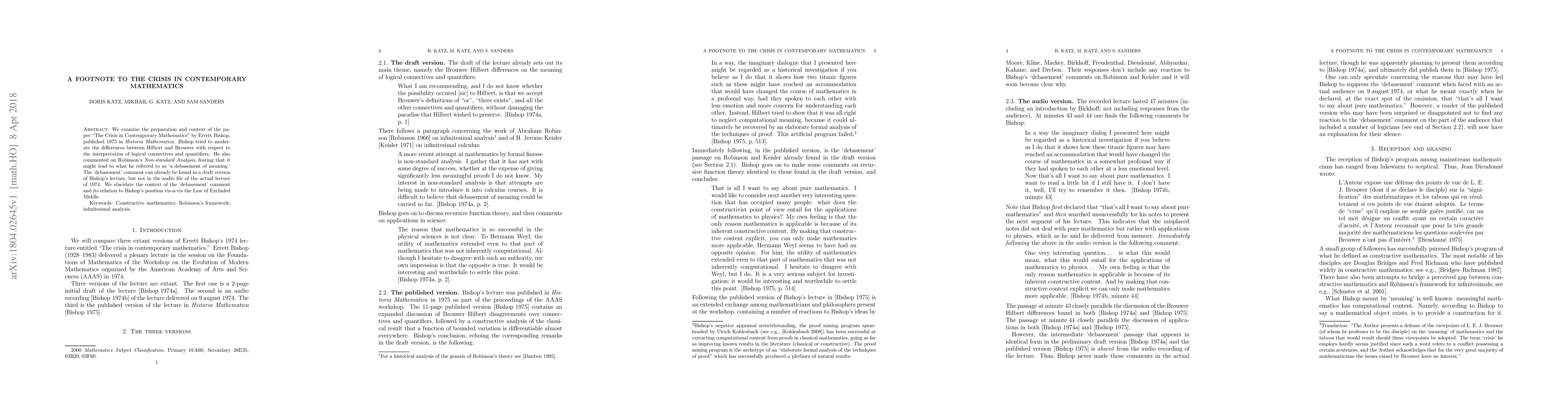 We examine the preparation and context of the paper "The Crisis in Contemporary Mathematics" by Errett Bishop, published 1975 in Historia Mathematica. Bishop tried to moderate the differences between Hilbert and Brouwer with respect to the interpretation of logical connectives and quantifiers. He also commented on Robinson's Non-standard Analysis, fearing that it might lead to what he referred to as 'a debasement of meaning.' The 'debasement' comment can already be found in a draft version of Bishop's lecture, but not in the audio file of the actual lecture of 1974. We elucidate the context of the 'debasement' comment and its relation to Bishop's position vis-a-vis the Law of Excluded Middle. Keywords: Constructive mathematics; Robinson's framework; infinitesimal analysis.