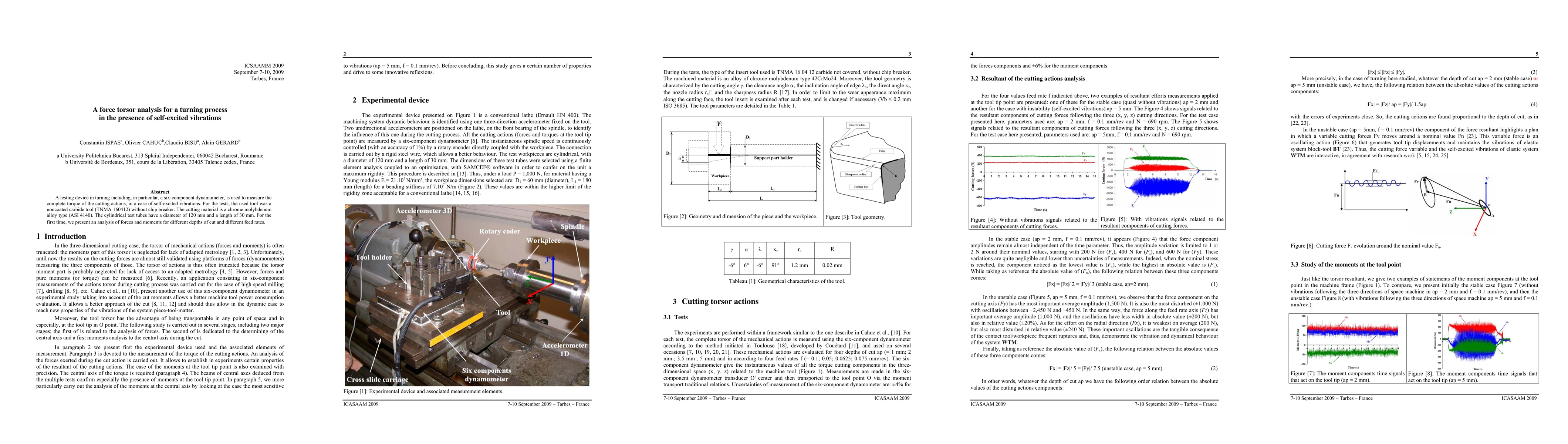 A testing device in turning including, in particular, a six-component dynamometer, is used to measure the complete torque of the cutting actions, in a case of self-excited vibrations. For the tests, the used tool was a noncoated carbide tool (TNMA 160412) without chip breaker. The cutting material is a chrome molybdenum alloy type (ASI 4140). The cylindrical test tubes have a diameter of 120 mm and a length of 30 mm. For the first time, we present an analysis of forces and moments for different depths of cut and different feed rates.