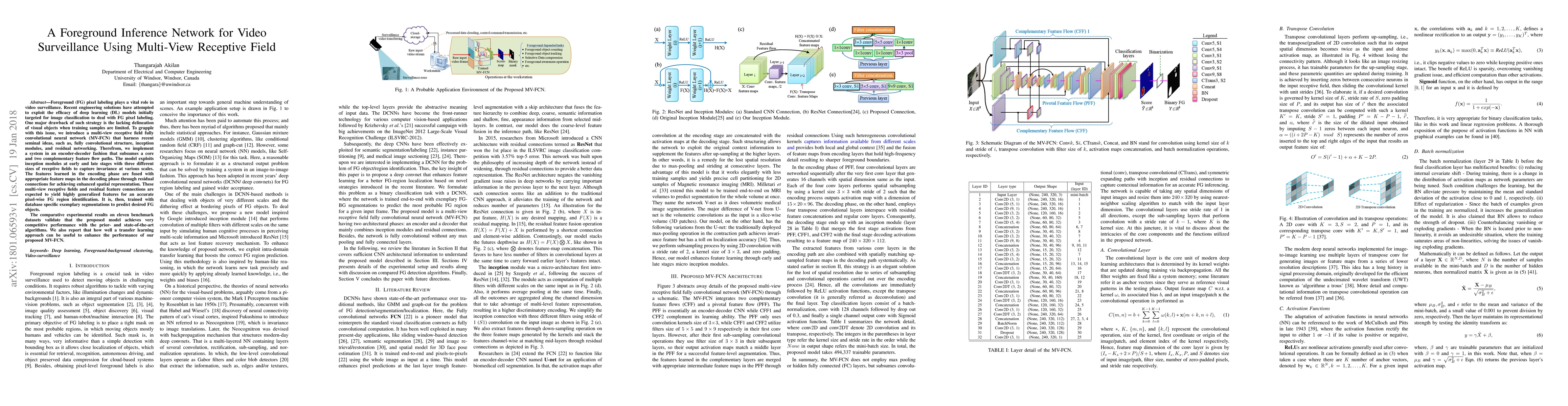 This paper proposes a multi-view receptive field fully convolutional neural network (MV-FCN) for accurate foreground pixel labeling in video surveillance. The model uses inception modules and residual connections to enhance spatial representation and generalize features, achieving competitive performance on benchmark datasets.