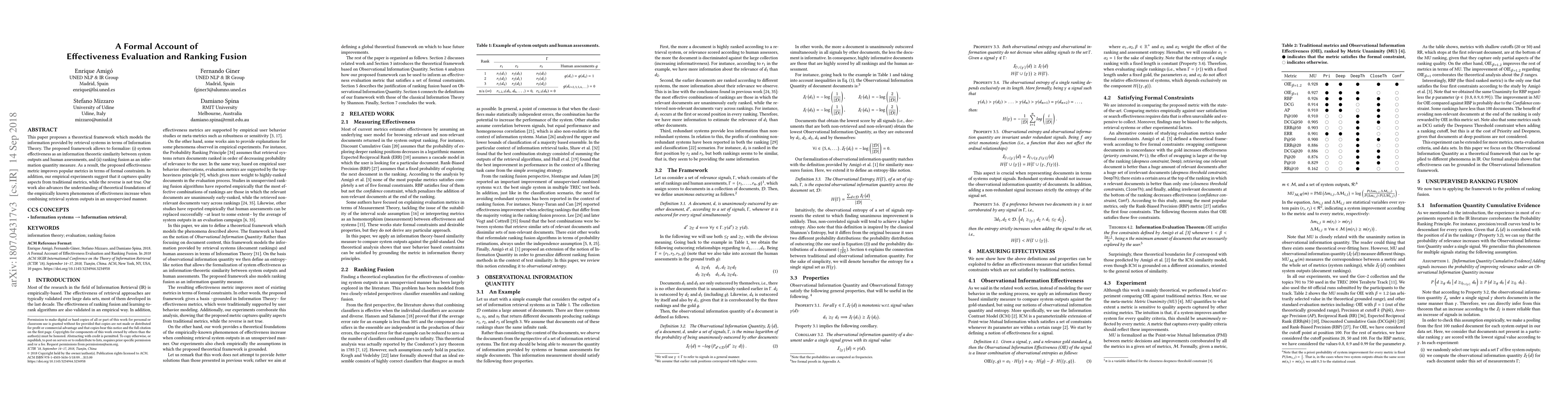 This paper proposes a new framework to evaluate and rank retrieval systems, using information theory to measure effectiveness and ranking fusion. The approach improves existing metrics with formal constraints and captures quality aspects not found in traditional metrics.