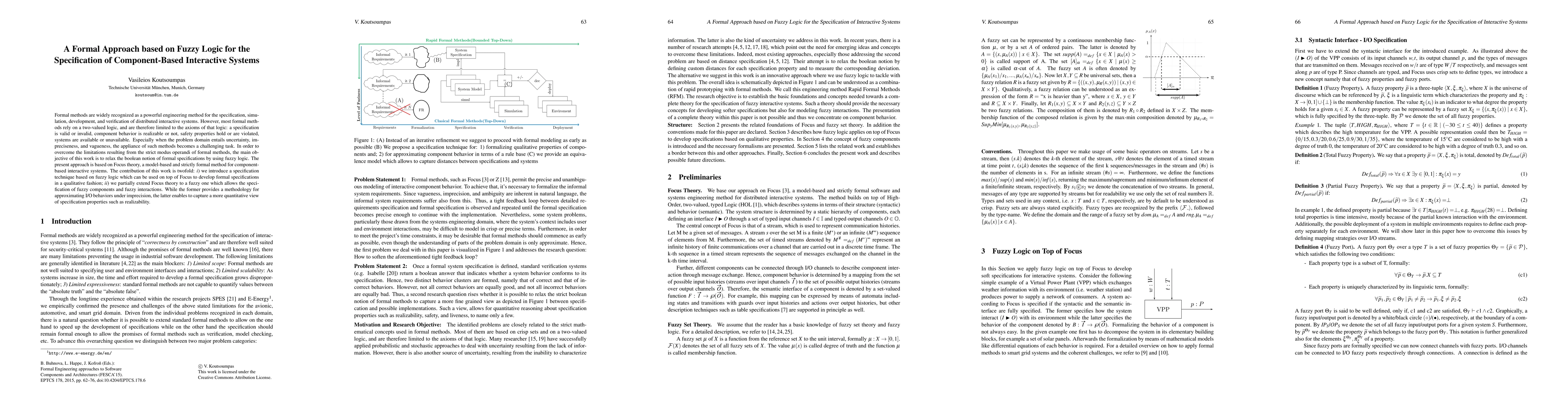 Formal methods are widely recognized as a powerful engineering method for the specification, simulation, development, and verification of distributed interactive systems. However, most formal methods rely on a two-valued logic, and are therefore limited to the axioms of that logic: a specification is valid or invalid, component behavior is realizable or not, safety properties hold or are violated, systems are available or unavailable. Especially when the problem domain entails uncertainty, impreciseness, and vagueness, the appliance of such methods becomes a challenging task. In order to overcome the limitations resulting from the strict modus operandi of formal methods, the main objective of this work is to relax the boolean notion of formal specifications by using fuzzy logic. The present approach is based on Focus theory, a model-based and strictly formal method for componentbased interactive systems. The contribution of this work is twofold: i) we introduce a specification technique based on fuzzy logic which can be used on top of Focus to develop formal specifications in a qualitative fashion; ii) we partially extend Focus theory to a fuzzy one which allows the specification of fuzzy components and fuzzy interactions. While the former provides a methodology for approximating I/O behaviors under imprecision, the latter enables to capture a more quantitative view of specification properties such as realizability.