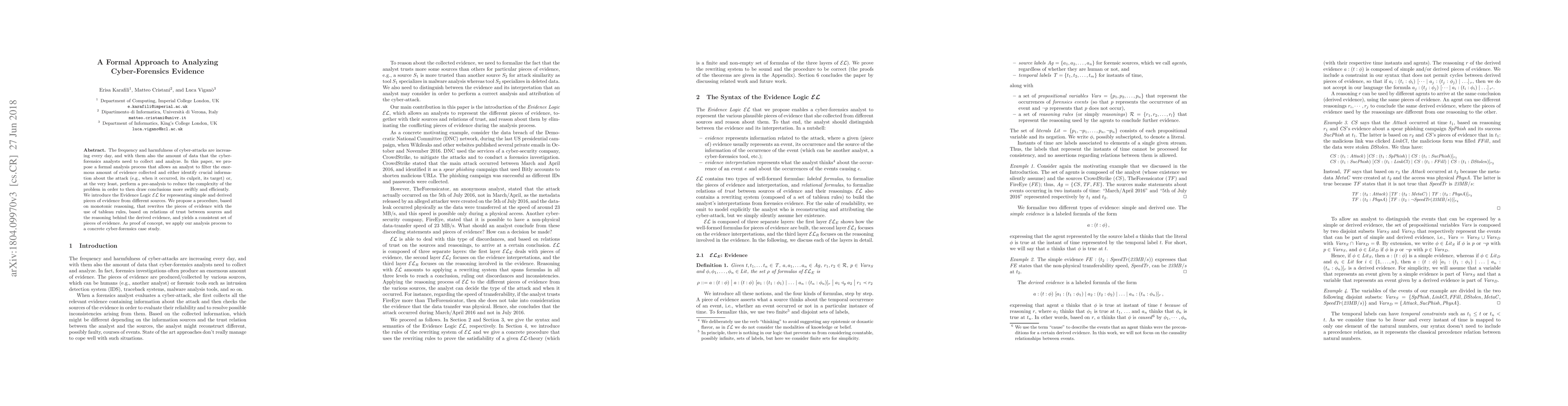 The frequency and harmfulness of cyber-attacks are increasing every day, and with them also the amount of data that the cyber-forensics analysts need to collect and analyze. In this paper, we propose a formal analysis process that allows an analyst to filter the enormous amount of evidence collected and either identify crucial information about the attack (e.g., when it occurred, its culprit, its target) or, at the very least, perform a pre-analysis to reduce the complexity of the problem in order to then draw conclusions more swiftly and efficiently. We introduce the Evidence Logic EL for representing simple and derived pieces of evidence from different sources. We propose a procedure, based on monotonic reasoning, that rewrites the pieces of evidence with the use of tableau rules, based on relations of trust between sources and the reasoning behind the derived evidence, and yields a consistent set of pieces of evidence. As proof of concept, we apply our analysis process to a concrete cyber-forensics case study.