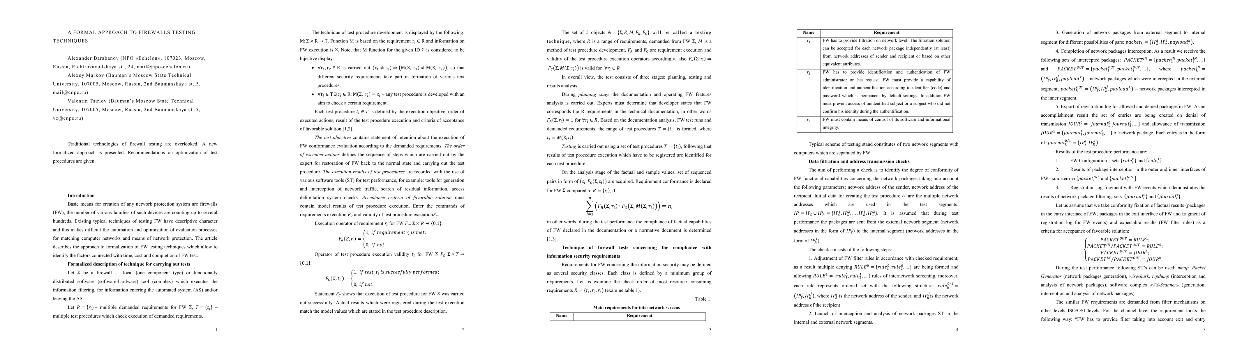 Traditional technologies of firewall testing are overlooked. A new formalized approach is presented. Recommendations on optimization of test procedures are given.