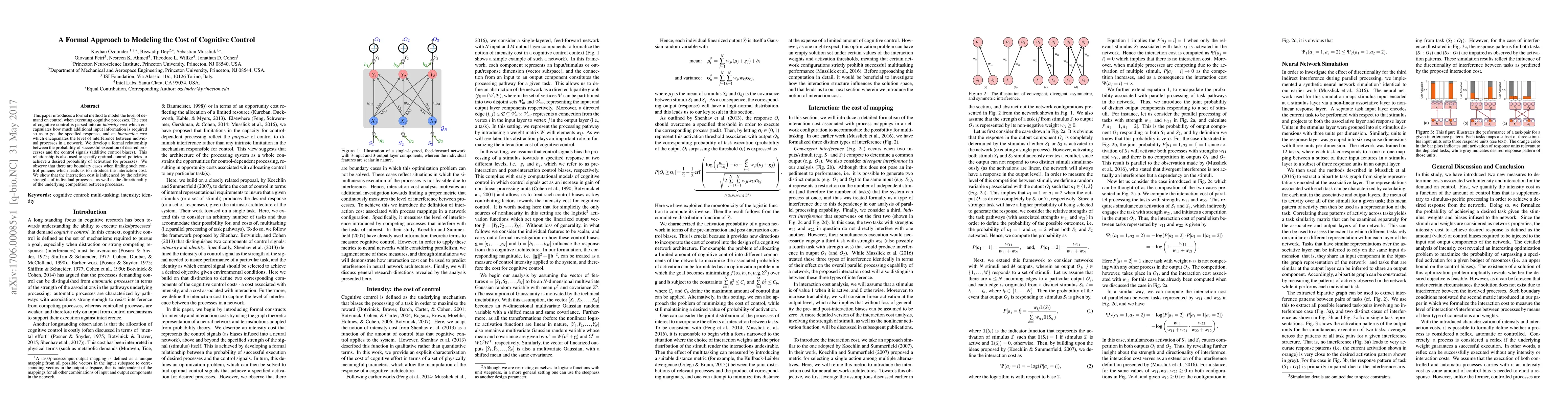This paper introduces a formal method to model the cost of cognitive control, dividing it into intensity and interaction costs, and shows how these costs influence optimal control policies to achieve desired probabilities of activation for processes.