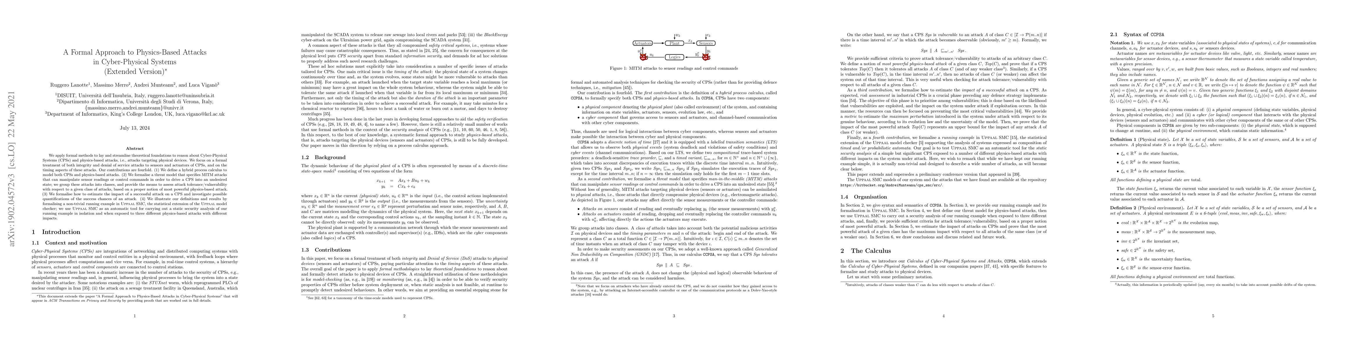 We apply formal methods to lay and streamline theoretical foundations to reason about Cyber-Physical Systems (CPSs) and physics-based attacks, i.e., attacks targeting physical devices. We focus on a formal treatment of both integrity and denial of service attacks to sensors and actuators of CPSs, and on the timing aspects of these attacks. Our contributions are fourfold. (1)~We define a hybrid process calculus to model both CPSs and physics-based attacks. (2)~We formalise a threat model that specifies MITM attacks that can manipulate sensor readings or control commands in order to drive a CPS into an undesired state, and we provide the means to assess attack tolerance/vulnerability with respect to a given attack. (3)~We formalise how to estimate the impact of a successful attack on a CPS and investigate possible quantifications of the success chances of an attack. (4)~We illustrate our definitions and results by formalising a non-trivial running example in Uppaal SMC, the statistical extension of the Uppaal model checker; we use Uppaal SMC as an automatic tool for carrying out a static security analysis of our running example in isolation and when exposed to three different physics-based attacks with different impacts.