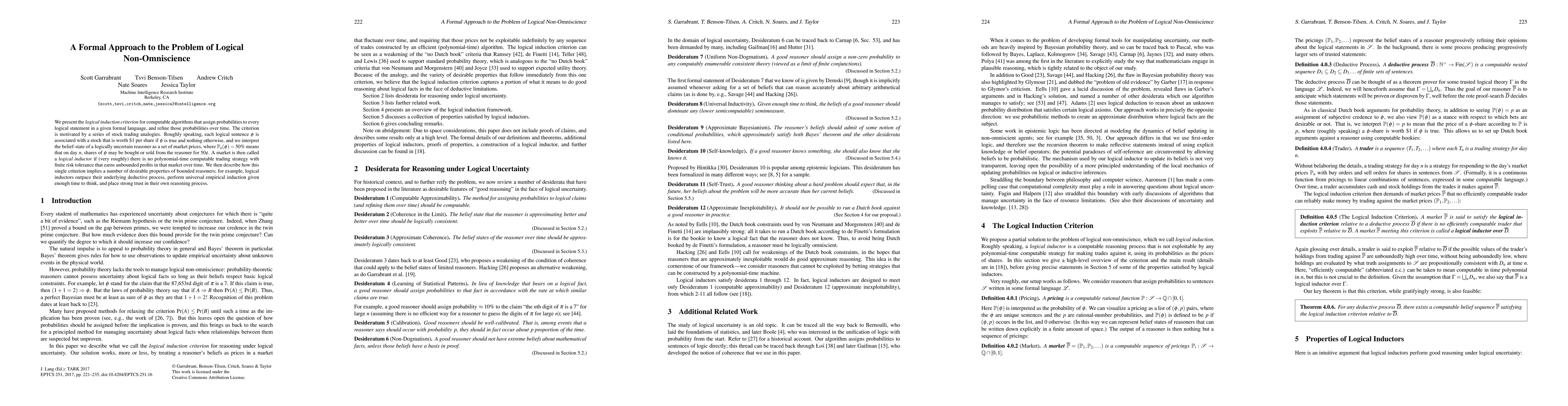 We present the logical induction criterion for computable algorithms that assign probabilities to every logical statement in a given formal language, and refine those probabilities over time. The criterion is motivated by a series of stock trading analogies. Roughly speaking, each logical sentence phi is associated with a stock that is worth $1 per share if phi is true and nothing otherwise, and we interpret the belief-state of a logically uncertain reasoner as a set of market prices, where pt_N(phi)=50% means that on day N, shares of phi may be bought or sold from the reasoner for 50%. A market is then called a logical inductor if (very roughly) there is no polynomial-time computable trading strategy with finite risk tolerance that earns unbounded profits in that market over time. We then describe how this single criterion implies a number of desirable properties of bounded reasoners; for example, logical inductors outpace their underlying deductive process, perform universal empirical induction given enough time to think, and place strong trust in their own reasoning process.