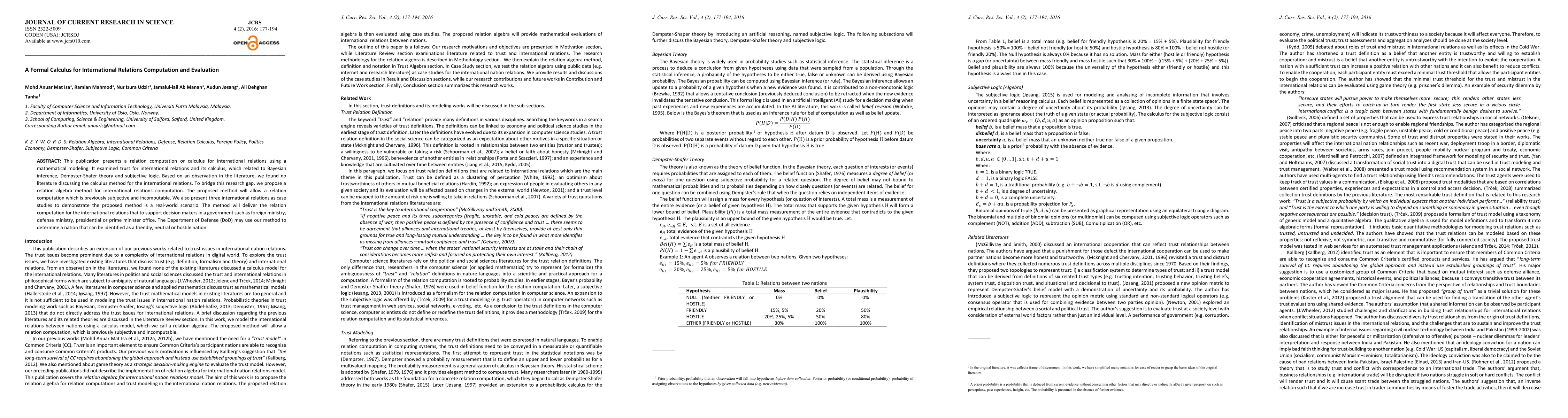 This publication presents a relation computation or calculus for international relations using a mathematical modeling. It examined trust for international relations and its calculus, which related to Bayesian inference, Dempster-Shafer theory and subjective logic. Based on an observation in the literature, we found no literature discussing the calculus method for the international relations. To bridge this research gap, we propose a relation algebra method for international relations computation. The proposed method will allow a relation computation which is previously subjective and incomputable. We also present three international relations as case studies to demonstrate the proposed method is a real-world scenario. The method will deliver the relation computation for the international relations that to support decision makers in a government such as foreign ministry, defense ministry, presidential or prime minister office. The Department of Defense (DoD) may use our method to determine a nation that can be identified as a friendly, neutral or hostile nation.