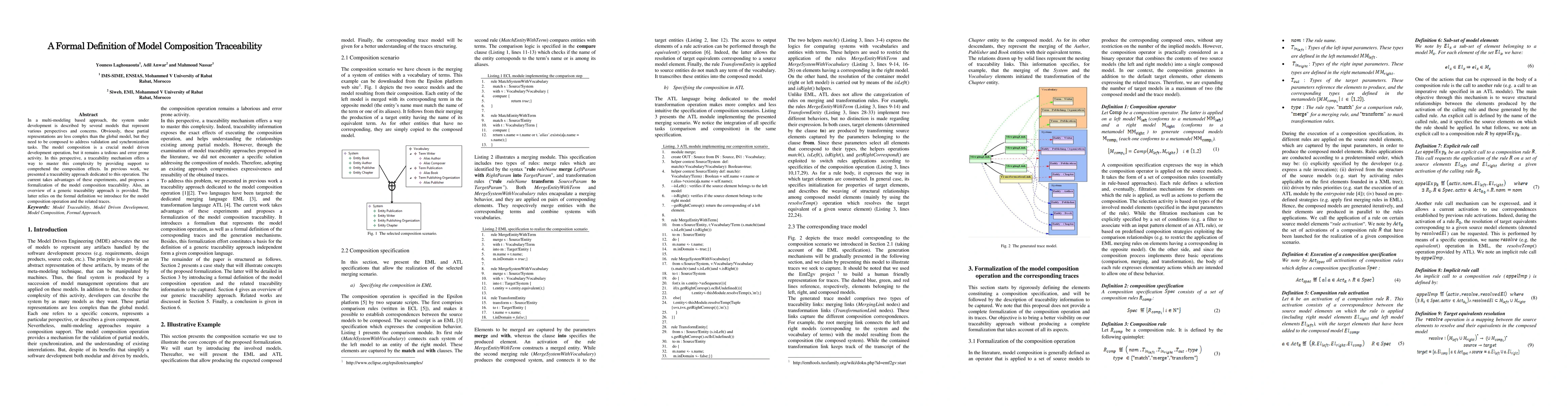 In a multi-modeling based approach, the system under development is described by several models that represent various perspectives and concerns. Obviously, these partial representations are less complex than the global model, but they need to be composed to address validation and synchronization tasks. The model composition is a crucial model driven development operation, but it remains a tedious and error prone activity. In this perspective, a traceability mechanism offers a way to master this complexity by providing support to comprehend the composition effects. In previous work, we presented a traceability approach dedicated to this operation. The current takes advantages of these experiments, and proposes a formalization of the model composition traceability. Also, an overview of a generic traceability approach is provided. The latter relies on the formal definition we introduce for the model composition operation and the related traces.