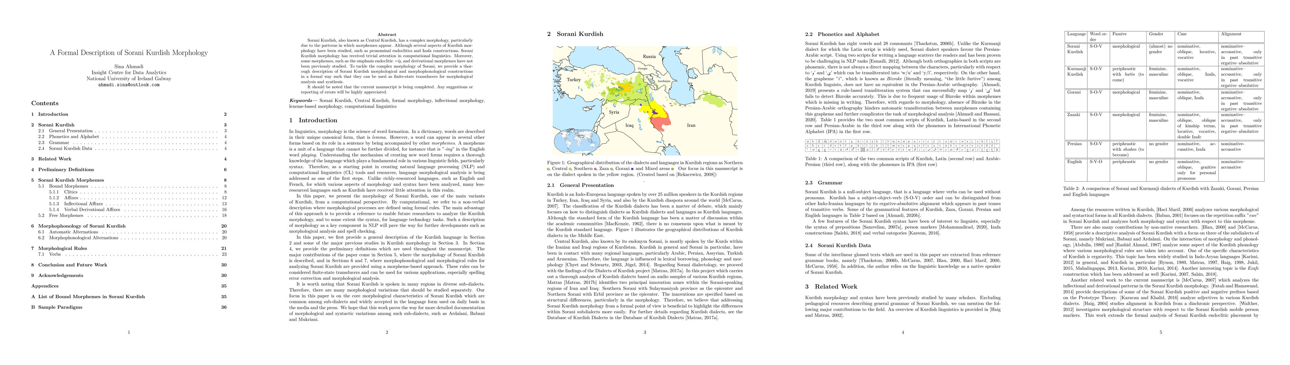 This paper provides a formal description of Sorani Kurdish morphology, focusing on previously understudied morphemes and constructions. It aims to facilitate computational linguistic analysis by presenting these morphological and morphophonological rules as finite-state transducers.
