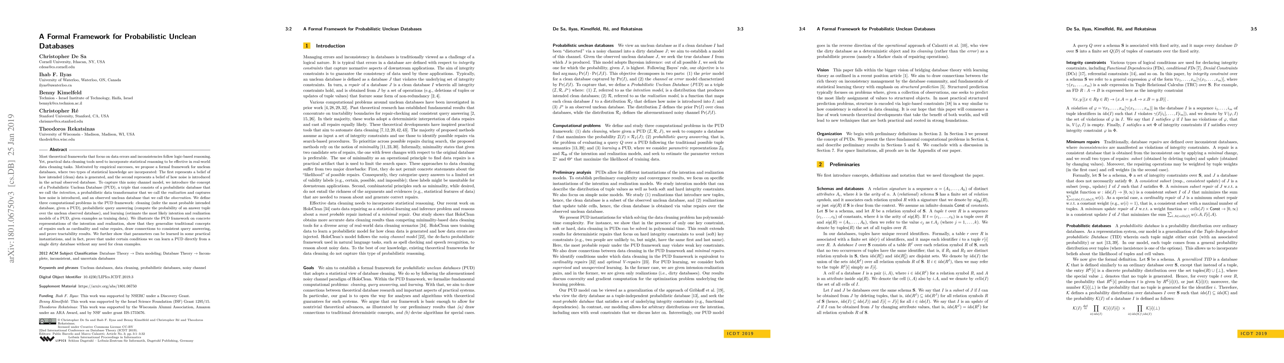This paper proposes a formal framework for probabilistic unclean databases (PUD) that incorporates statistical reasoning to address real-world data cleaning tasks. The framework defines three computational problems: cleaning, probabilistic query answering, and learning, and demonstrates its applicability and tractability.