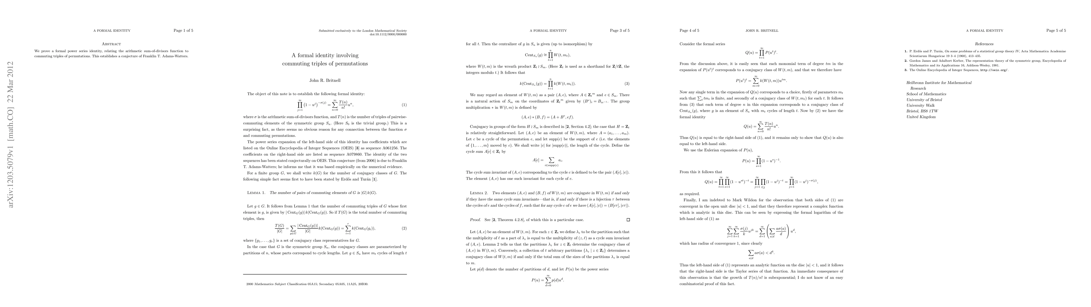 Researchers prove a formal power series identity relating the sum-of-divisors function to commuting triples of permutations, resolving a conjecture made by Franklin T. Adams-Watters.