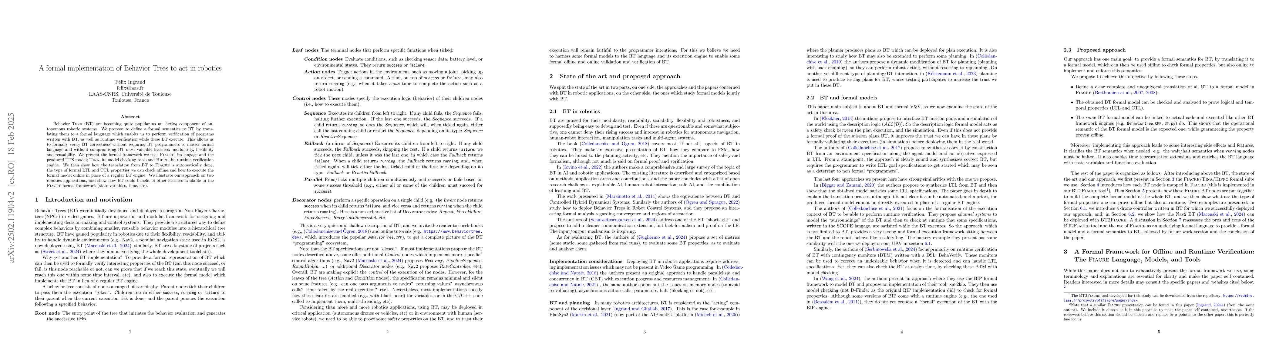This paper introduces a formal implementation of Behavior Trees (BT) in robotics, proposing a translation to a formal language (Fiacre) to enable verification. The authors present tools for offline model checking and runtime verification, demonstrating how BT can maintain modularity and flexibility while ensuring correctness.