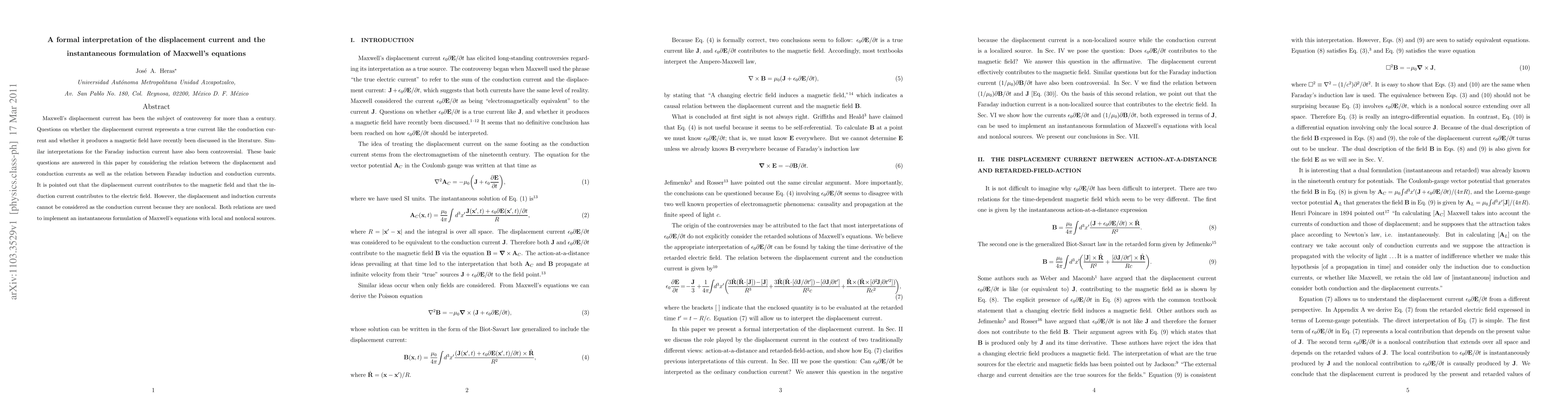 This paper resolves longstanding debates about the nature of Maxwell's displacement current, affirming its contribution to the magnetic field and distinguishing it from conduction current due to its nonlocal nature. It also introduces an instantaneous formulation of Maxwell's equations incorporating both local and nonlocal sources.