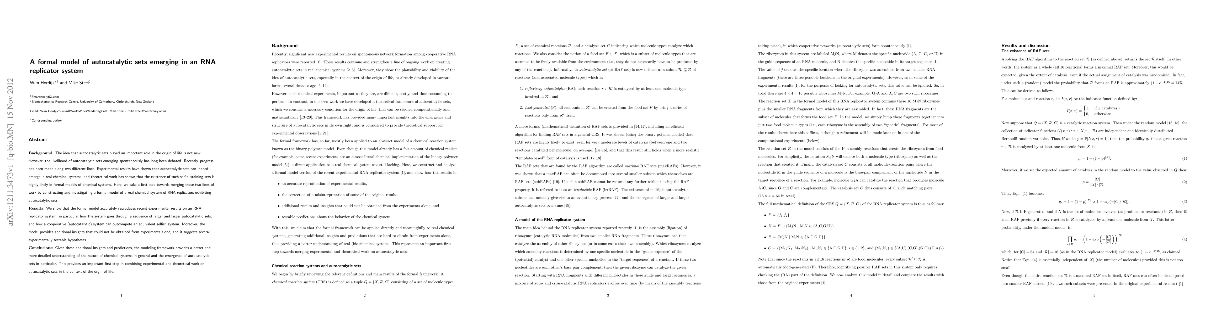 This paper constructs a formal model of RNA replicator systems to explore the emergence of autocatalytic sets, demonstrating that the model accurately replicates experimental results and offers new insights into the dynamics of autocatalytic systems, thus bridging theoretical and experimental research.