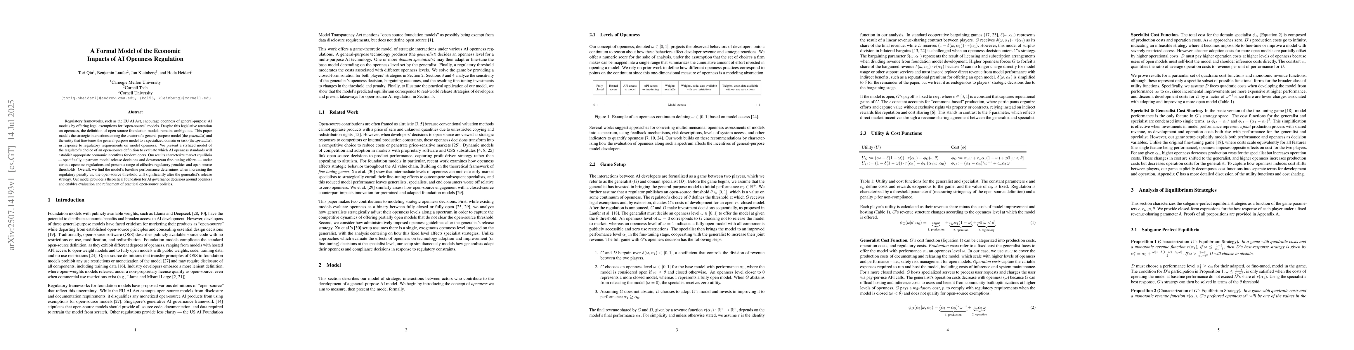 Regulatory frameworks, such as the EU AI Act, encourage openness of general-purpose AI models by offering legal exemptions for "open-source" models. Despite this legislative attention on openness, the definition of open-source foundation models remains ambiguous. This paper models the strategic interactions among the creator of a general-purpose model (the generalist) and the entity that fine-tunes the general-purpose model to a specialized domain or task (the specialist), in response to regulatory requirements on model openness. We present a stylized model of the regulator's choice of an open-source definition to evaluate which AI openness standards will establish appropriate economic incentives for developers. Our results characterize market equilibria -- specifically, upstream model release decisions and downstream fine-tuning efforts -- under various openness regulations and present a range of effective regulatory penalties and open-source thresholds. Overall, we find the model's baseline performance determines when increasing the regulatory penalty vs. the open-source threshold will significantly alter the generalist's release strategy. Our model provides a theoretical foundation for AI governance decisions around openness and enables evaluation and refinement of practical open-source policies.