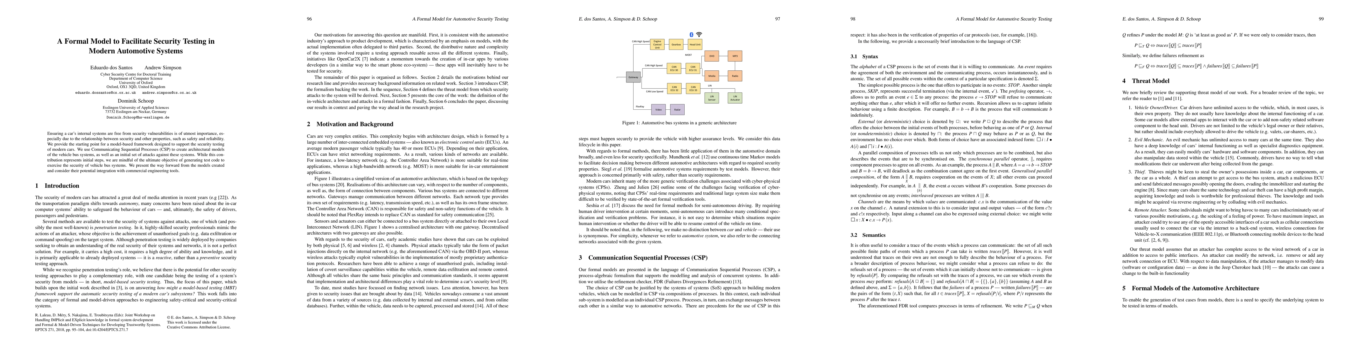 This research introduces a formal model using Communicating Sequential Processes (CSP) to create architectural models of vehicle bus systems for security testing. It outlines initial attack models and lays the groundwork for generating test code to ensure the security of modern car systems.