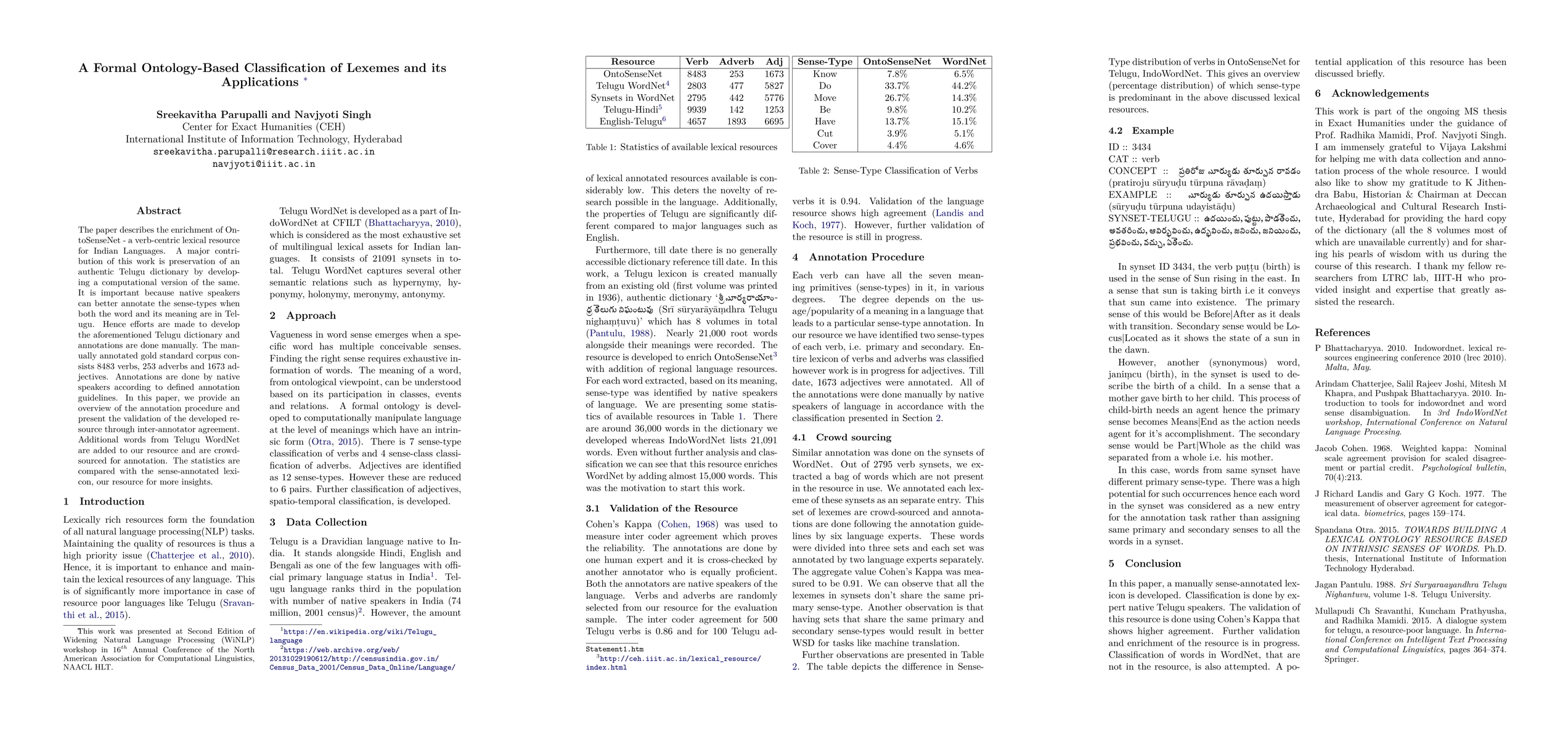 The paper describes the enrichment of OntoSenseNet - a verb-centric lexical resource for Indian Languages. A major contribution of this work is preservation of an authentic Telugu dictionary by developing a computational version of the same. It is important because native speakers can better annotate the sense-types when both the word and its meaning are in Telugu. Hence efforts are made to develop the aforementioned Telugu dictionary and annotations are done manually. The manually annotated gold standard corpus consists 8483 verbs, 253 adverbs and 1673 adjectives. Annotations are done by native speakers according to defined annotation guidelines. In this paper, we provide an overview of the annotation procedure and present the validation of the developed resource through inter-annotator agreement. Additional words from Telugu WordNet are added to our resource and are crowd-sourced for annotation. The statistics are compared with the sense-annotated lexicon, our resource for more insights.