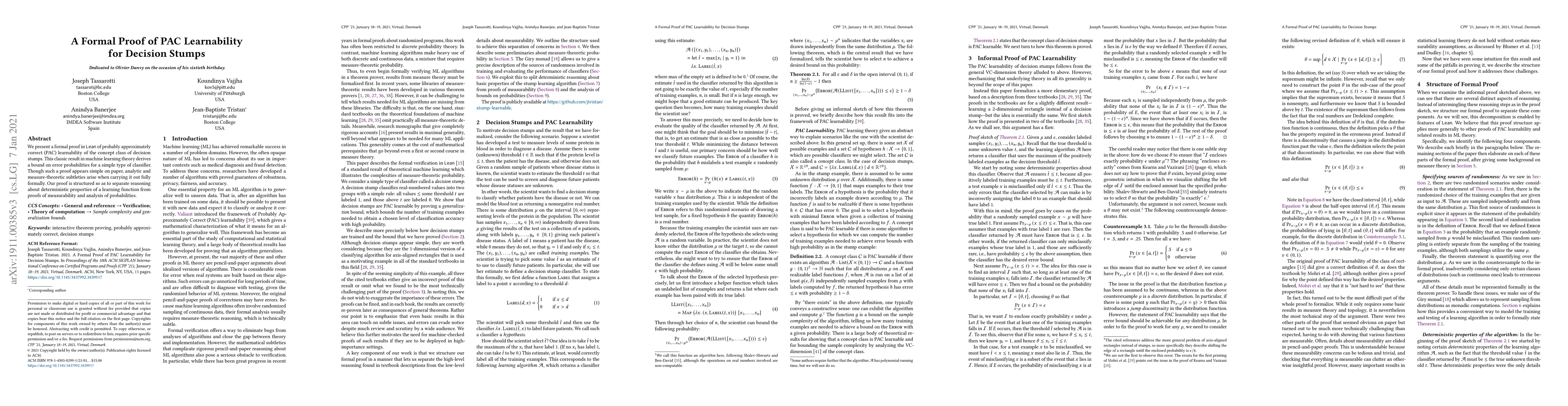 This paper provides a formal proof in Lean of the PAC learnability of decision stumps, addressing analytic and measure-theoretic subtleties. The proof separates reasoning about deterministic properties from measurability and probabilistic analysis.