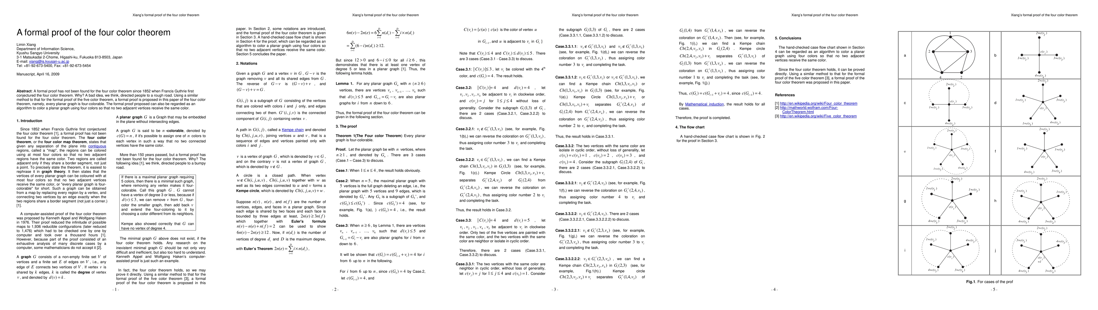 This paper presents a formal proof of the four color theorem, demonstrating that every planar graph can be colored with just four colors such that no two adjacent vertices share the same color. The proof employs a method similar to the five color theorem's formal proof and can be viewed as an algorithm for coloring planar graphs.