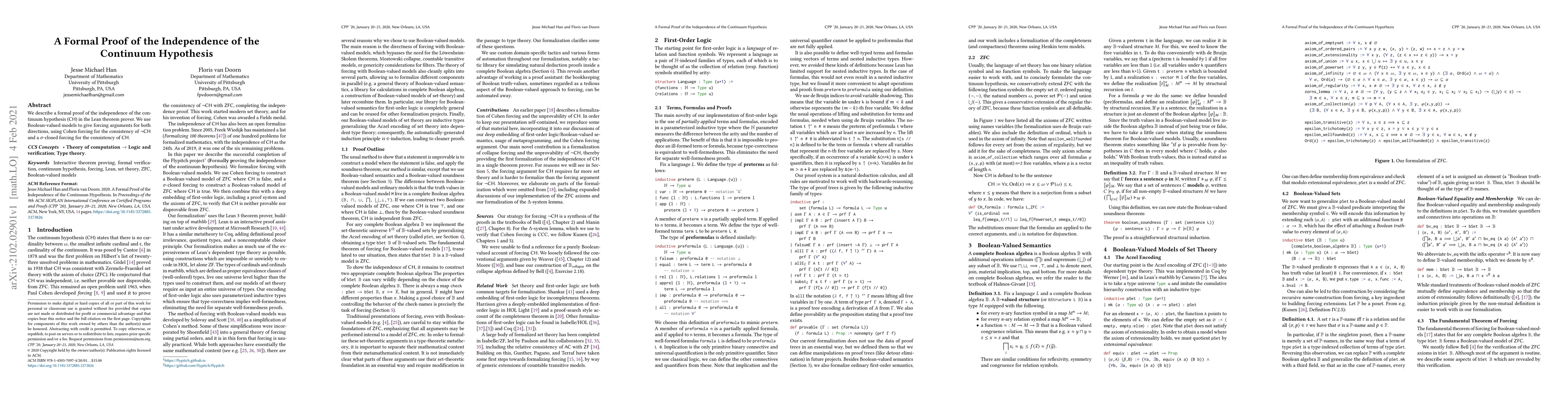 This paper presents a formal proof of the independence of the continuum hypothesis ($\mathsf{CH}$) in the Lean theorem prover, utilizing Boolean-valued models and employing Cohen forcing to show $\neg \mathsf{CH}$ and a $\sigma$-closed forcing to demonstrate $\mathsf{CH}$.