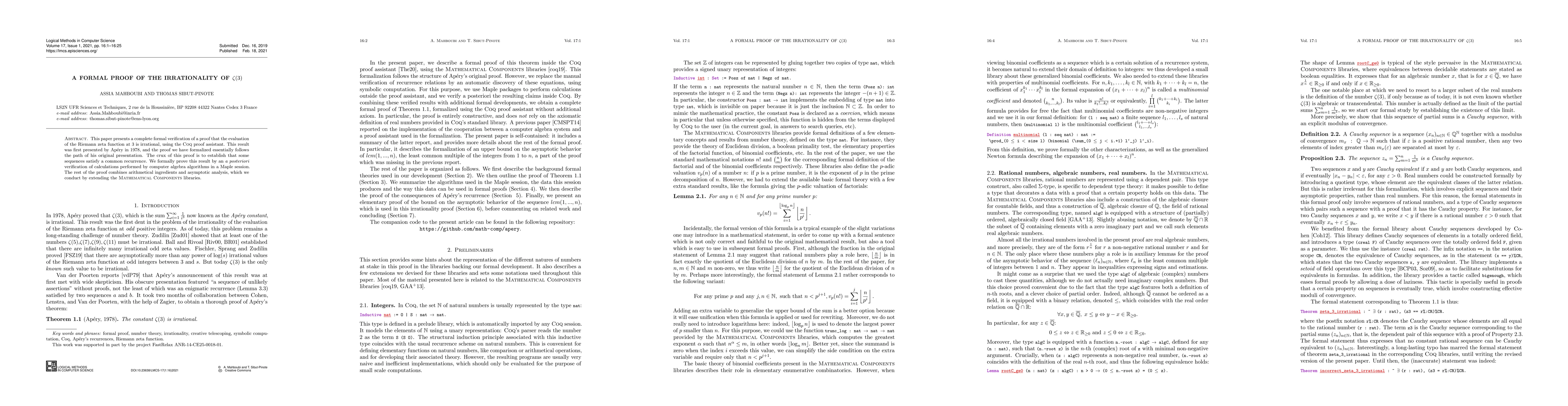 The paper presents a formalization of Apéry's proof of the irrationality of ζ(3) using the Coq proof assistant, demonstrating the practicality of formal verification for number-theoretic results.