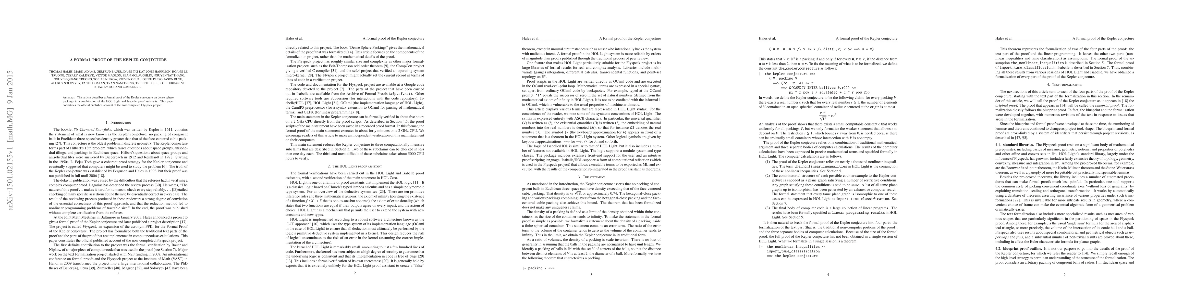 This paper presents a formal proof of the Kepler conjecture using the HOL Light and Isabelle proof assistants, marking the culmination of the Flyspeck project. The proof rigorously verifies the densest possible arrangement of spheres in three-dimensional space.