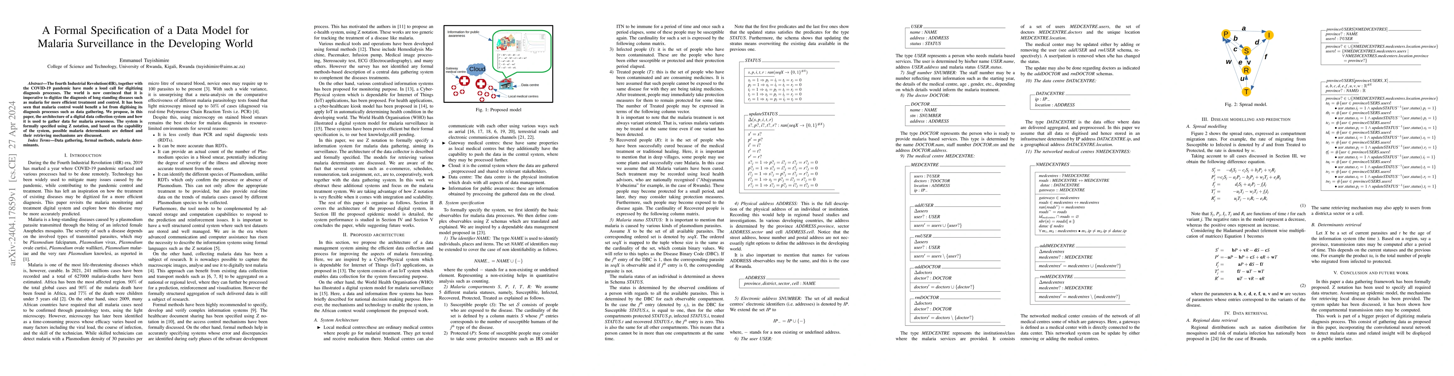 The fourth Industrial Revolution(4IR), together with the COVID-19 pandemic have made a loud call for digitizing diagnosis processes. The world is now convinced that it is imperative to digitize the diagnosis of long standing diseases such as malaria for more efficient treatment and control. It has been seen that malaria control would benefit a lot from digitizing its diagnosis processes such as data gathering. We propose, in this paper, the architecture of a digital data collection system and how it is used to gather data for malaria awareness. The system is formally specified using Z notation, and based on the capability of the system, possible malaria determinants are defined and their retrieving mechanisms are discussed.