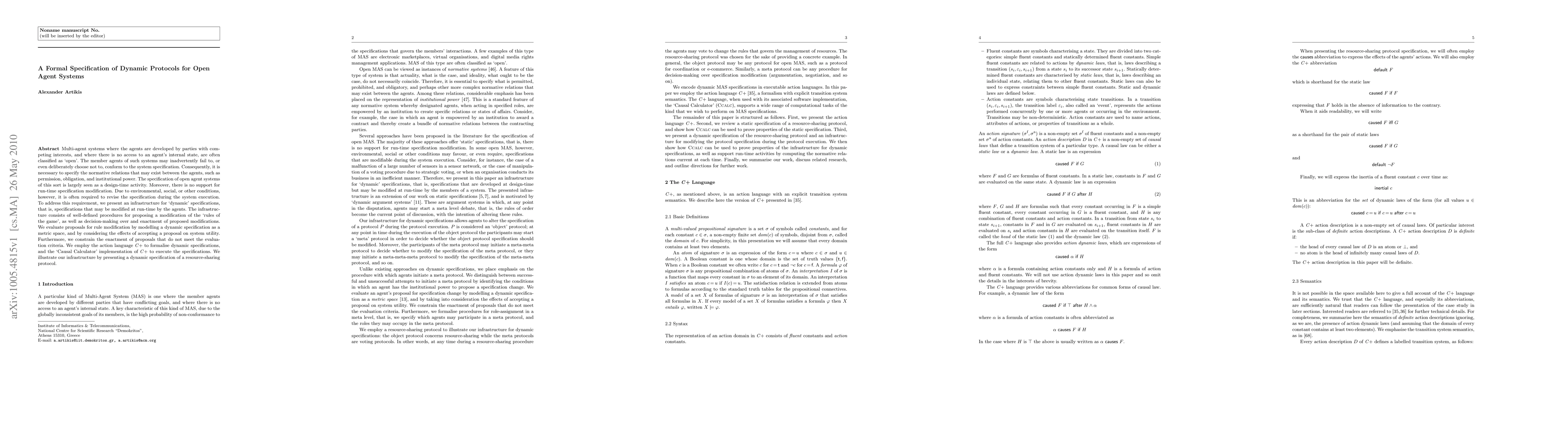 This paper proposes an infrastructure for dynamic specifications in open multi-agent systems, allowing run-time modifications to the rules governing agent interactions. The framework includes procedures for proposing and evaluating modifications, ensuring only those that enhance system utility are enacted.
