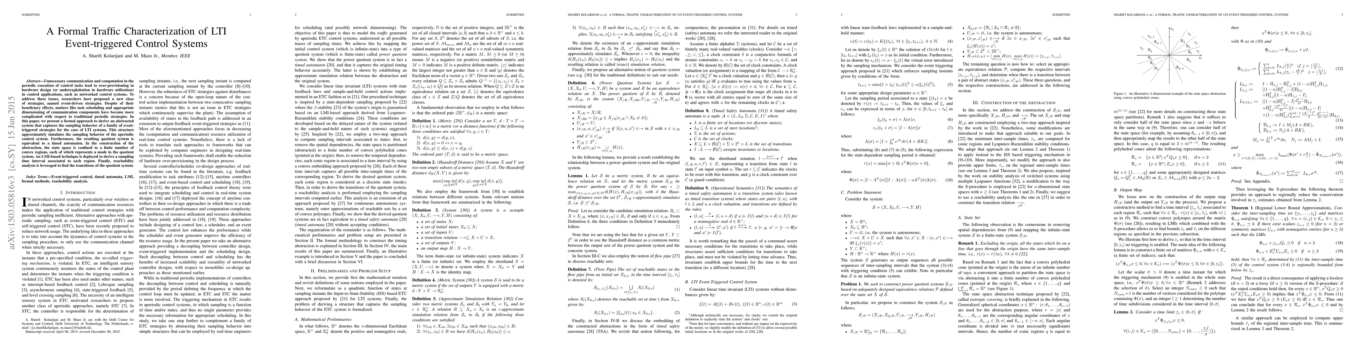 This paper proposes a formal method to characterize the traffic behavior of LTI event-triggered control systems, abstracting them into a finite-state timed automaton. The approach uses LMI-based techniques to determine appropriate sampling intervals and employs reachability analysis to model transitions.