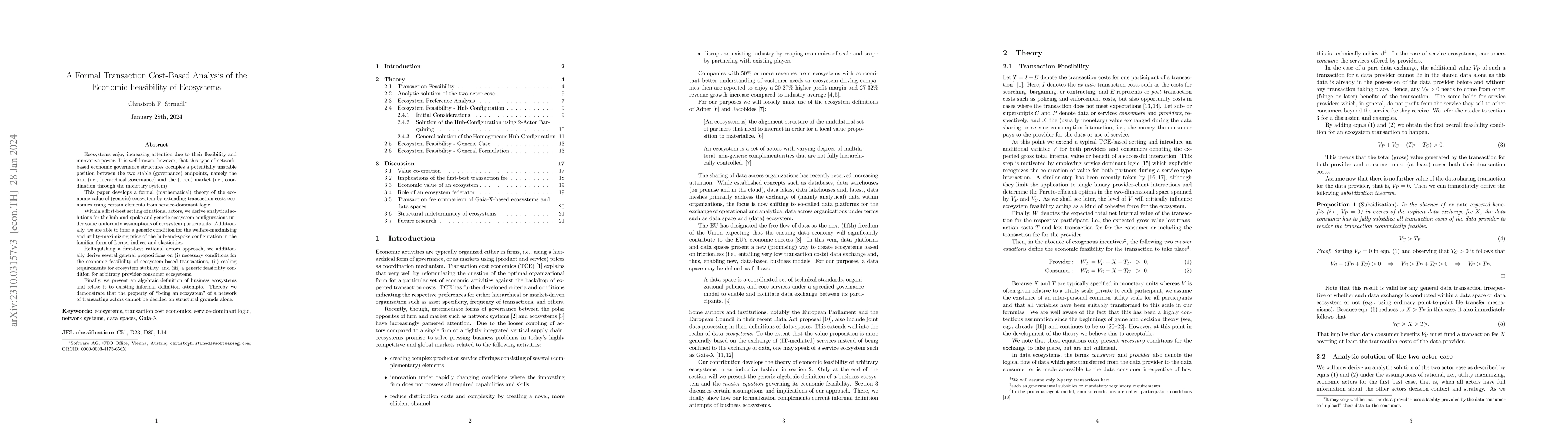 This paper develops a formal transaction cost-based theory to analyze the economic feasibility of business ecosystems, deriving analytical solutions for hub-and-spoke configurations and general propositions on ecosystem stability and economic feasibility. It also presents an algebraic definition of business ecosystems, arguing that their "ecosystem" status cannot be determined solely by structural features.