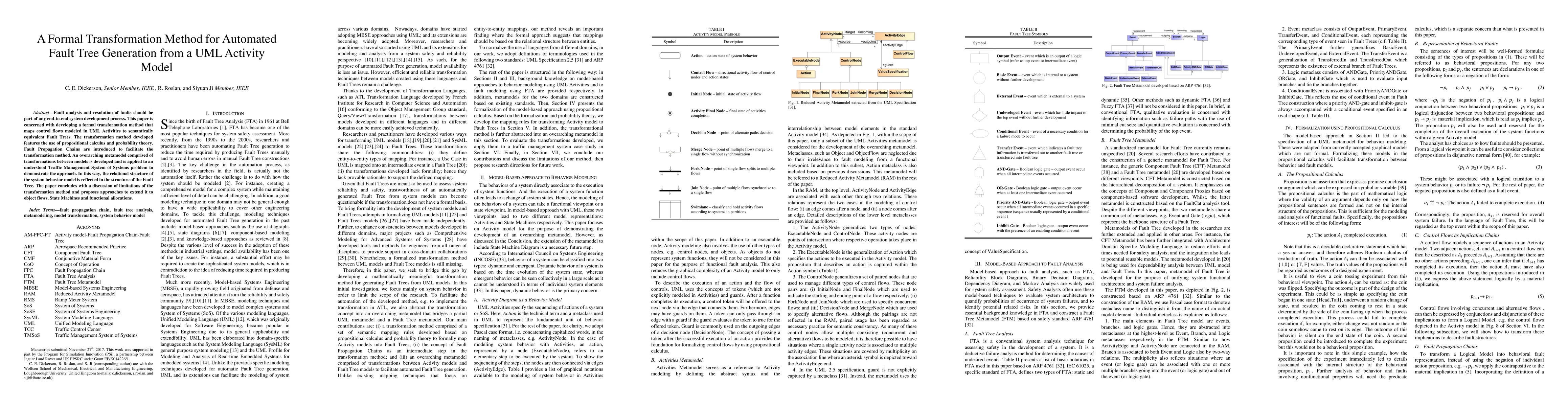 Fault analysis and resolution of faults should be part of any end-to-end system development process. This paper is concerned with developing a formal transformation method that maps control flows modeled in UML Activities to semantically equivalent Fault Trees. The transformation method developed features the use of propositional calculus and probability theory. Fault Propagation Chains are introduced to facilitate the transformation method. An overarching metamodel comprised of transformations between models is developed and is applied to an understood Traffic Management System of Systems problem to demonstrate the approach. In this way, the relational structure of the system behavior model is reflected in the structure of the Fault Tree. The paper concludes with a discussion of limitations of the transformation method and proposes approaches to extend it to object flows, State Machines and functional allocations.