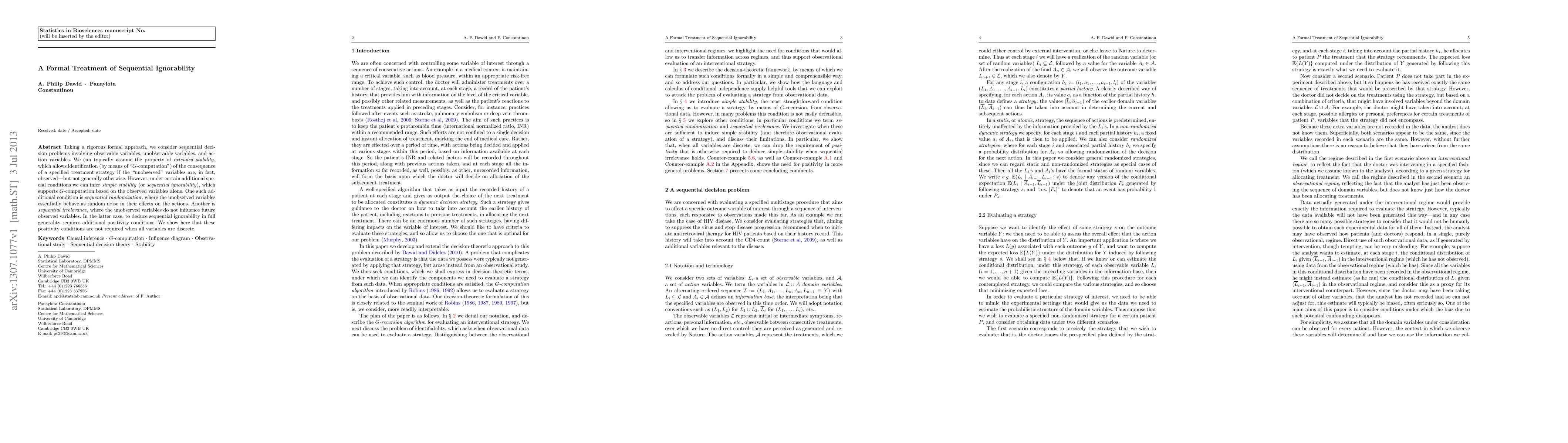 This paper rigorously explores sequential decision problems under extended stability, focusing on identifying treatment strategies. It introduces sequential ignorability under special conditions like sequential randomization and sequential irrelevance, demonstrating that discrete variables do not require additional positivity conditions for ignorability.